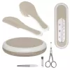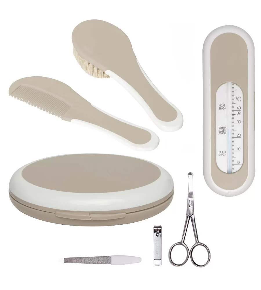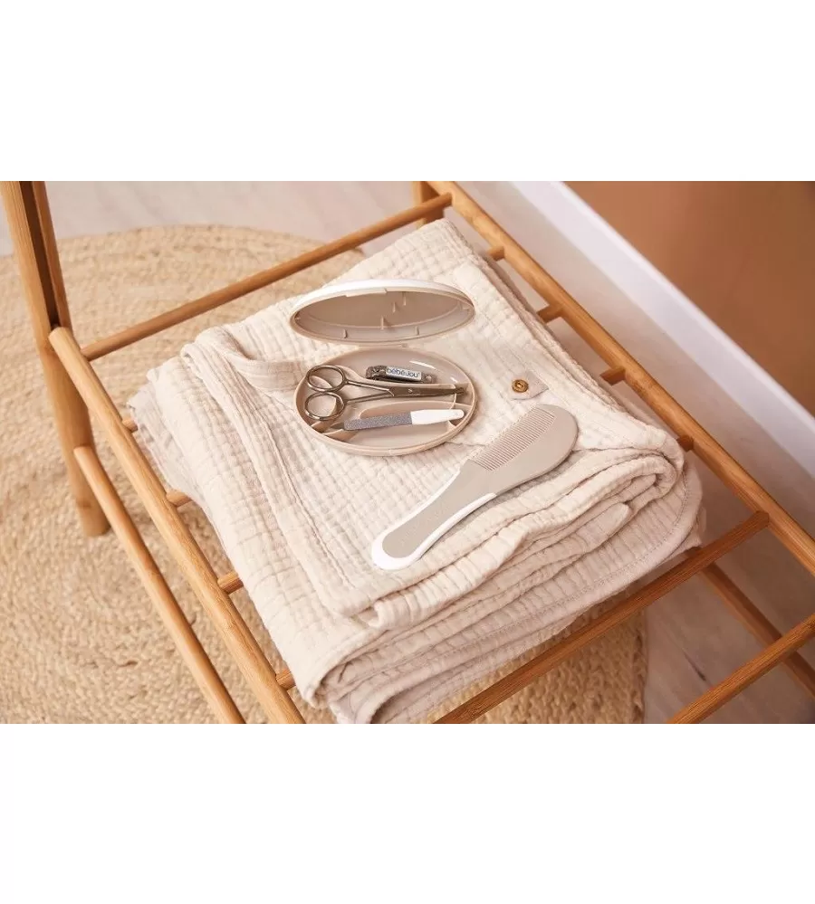 Manikůra obsahuje nůžky se zakulacenými konci, pilníček a kleštičky na nehty. Vše je vyrobeno z nerezavějící ušlechtilé oceli. Krabička chrání před prachem a pomáhá udržovat manikůru v čistotě. Ale i přesto před každým použitím jednotlivé nástroje pečlivě očistěte a u novorozenců i desinfikujte roztokem lihu.