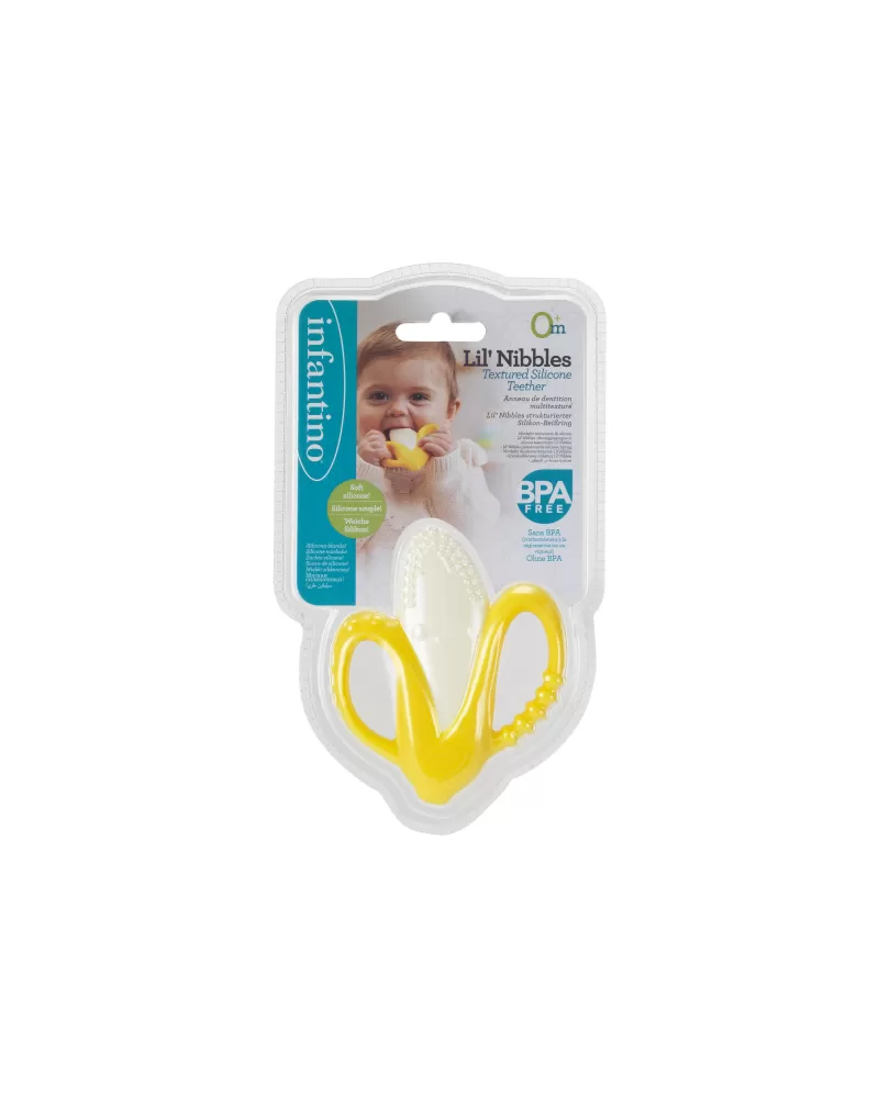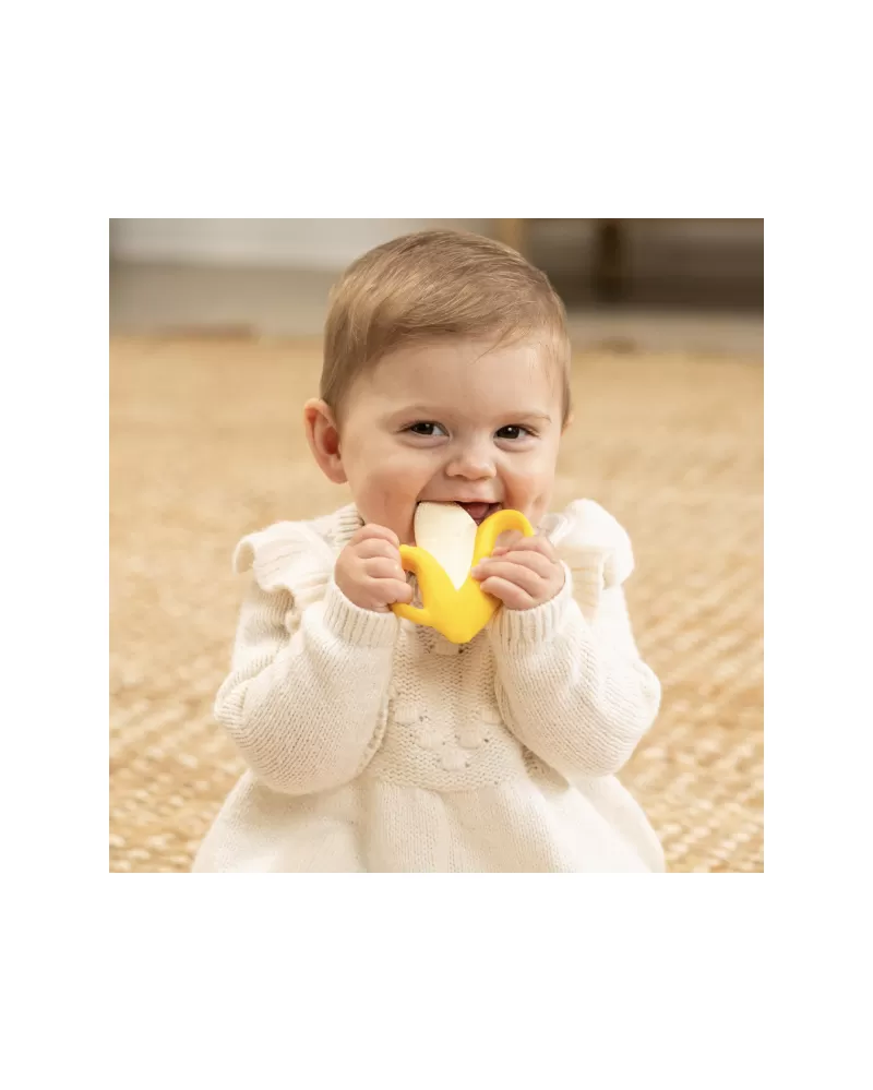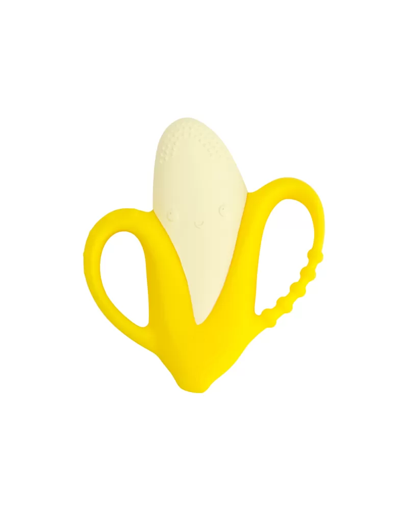 Rozkošné kousátko v podobě usměvavého banánu je vyrobeno z pružného měkkého silikonu. Různorodé textury lákají dítě ke zkoumání v ústech, masírováním dásní kousátko pomáhá dítěti při prořezávání prvních zoubků.