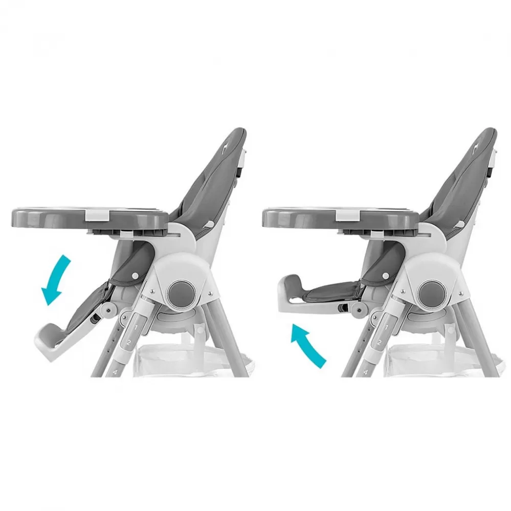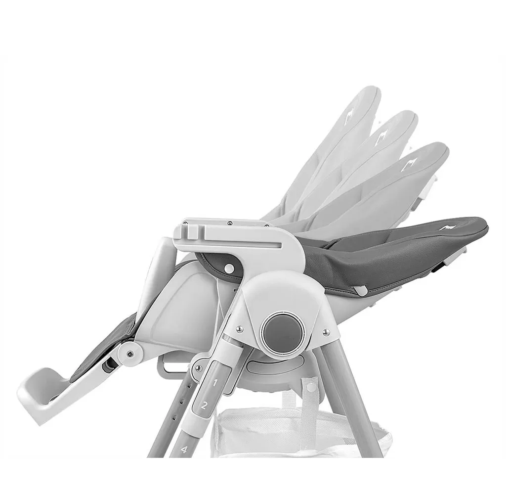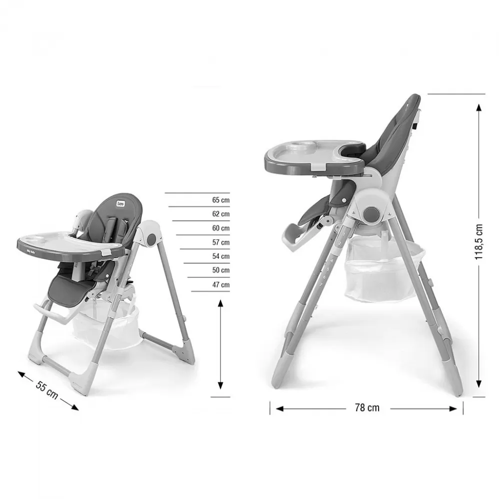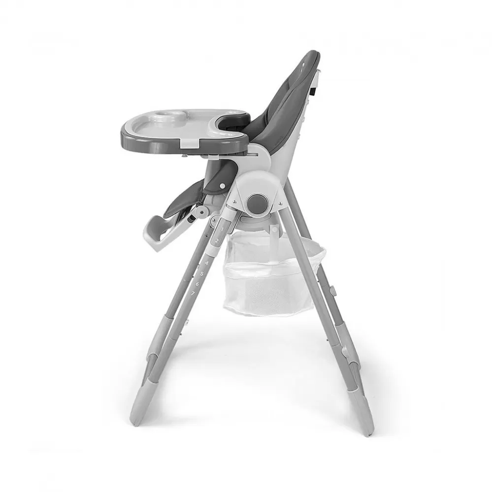 Čalounění židle je vyrobeno z ekologické kůže a má navíc měkkou vložku pro nejmenší. Pro bezpečnost dítěte je vybavena 5-ti bodovými nastavitelnými pásy a přídavnou zábranou proti uklouznutí. Na zadní straně opěradla je úchyt pro zavěšení tácu. Opěradlo i podnožku lze sklopit do lehu. Sedák lze zvednout nebo snížit v 7 stupních a nohy mají zabudovaná gumová kolečka. Celou konstrukci lze snadno a hladce složit.