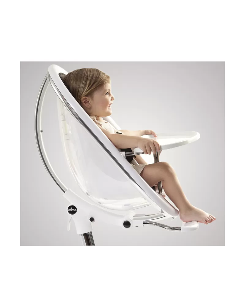 Stylová židlička Mima Moon je to pravé pro milovníky soudobého špičkového designu. Svým řešením 3v1 umožní dítěti být již od narození až do školního věku součástí rodinného stolování. Díky různým možnostem náklonu a volitelnému vkládacímu polstrování je vhodná pro miminka od narození. S odnímatelným pultem je použitelná jako židlička na krmení pro batolata od 6 měsíců. Vyjmutím vnitřního sedáku židličku snadno přeměníte v židli pro větší děti, které ji mohou používat samostatně u stolu. Židlička je velmi jednoduše výškově nastavitelná a ve své maximální výšce se hodí i ke kuchyňským barovým pultům. Pevná a stabilní konstrukce je zárukou bezpečí pro dítě.