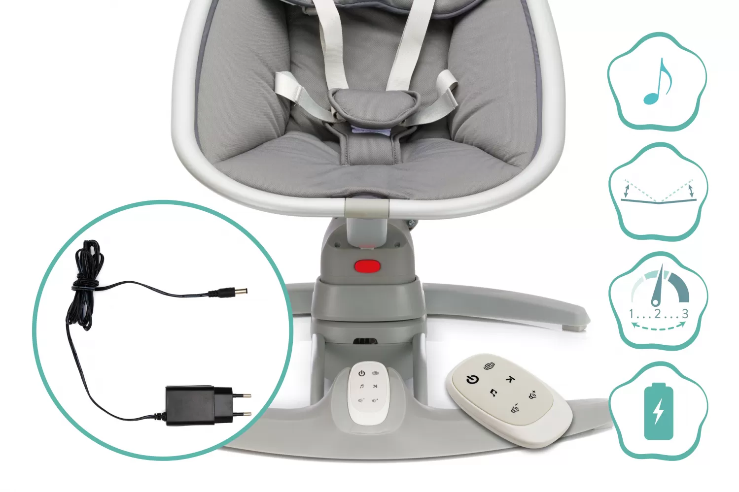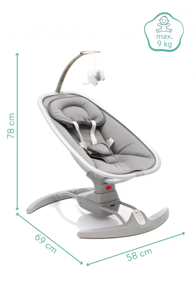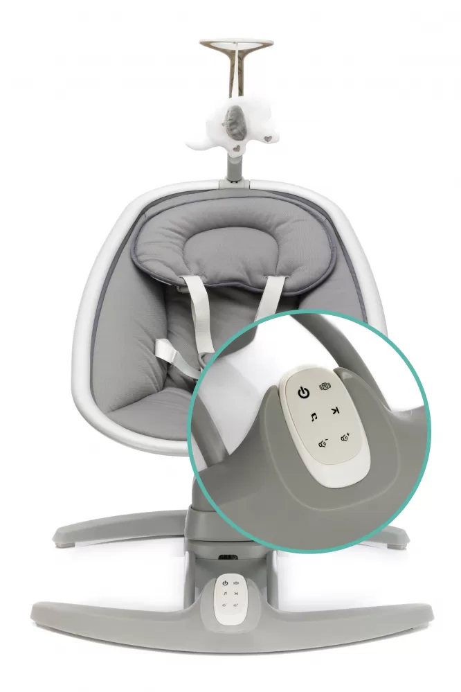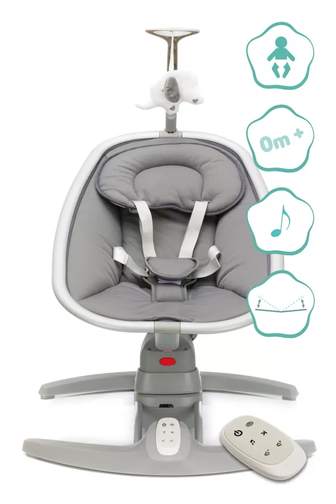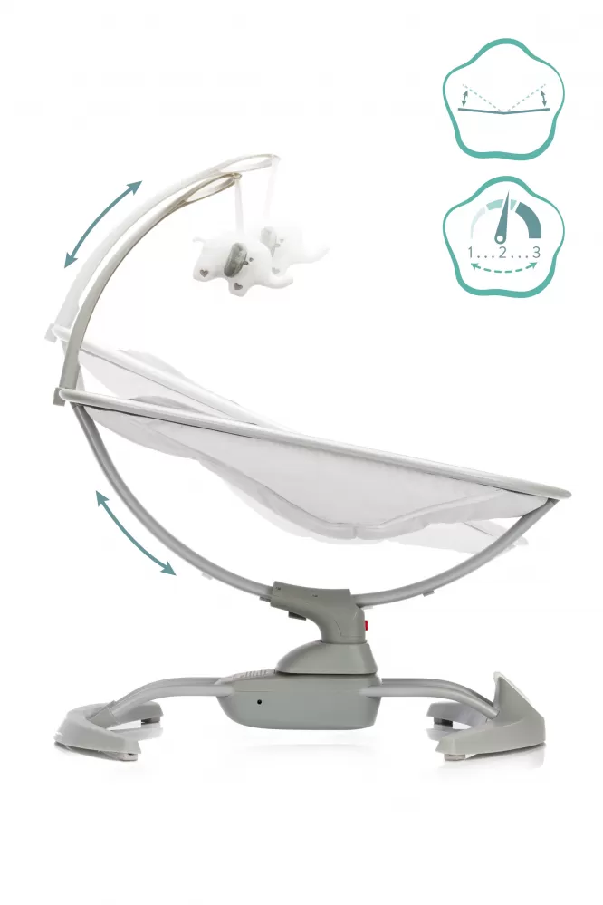 Elektrická houpačka bude pohodlné místo k odpočinku pro vaše dítě. Možnost sezení i ležení. 5bodový systém pásů pro bezpečnost dítěte, 8 různých melodií. 3 individuálně nastavitelné rychlosti houpání. Vhodné od narození do 9 kg. Houpačka je velmi stabilní a lze ji zapojit do sítě s přiloženým síťovým adaptérem.
