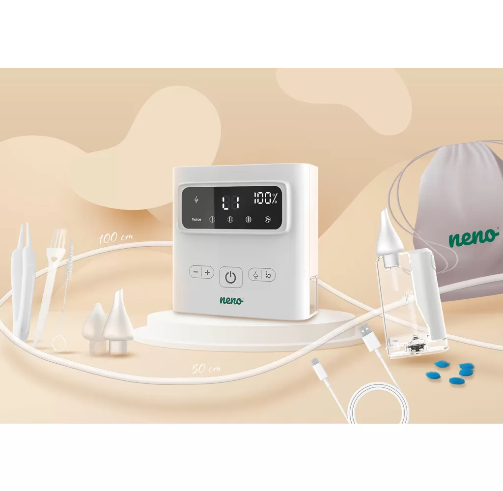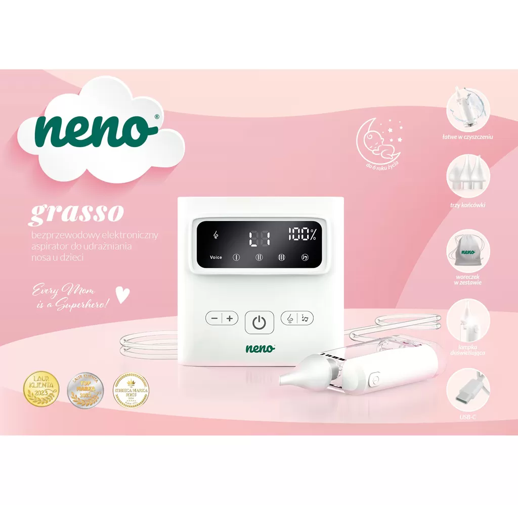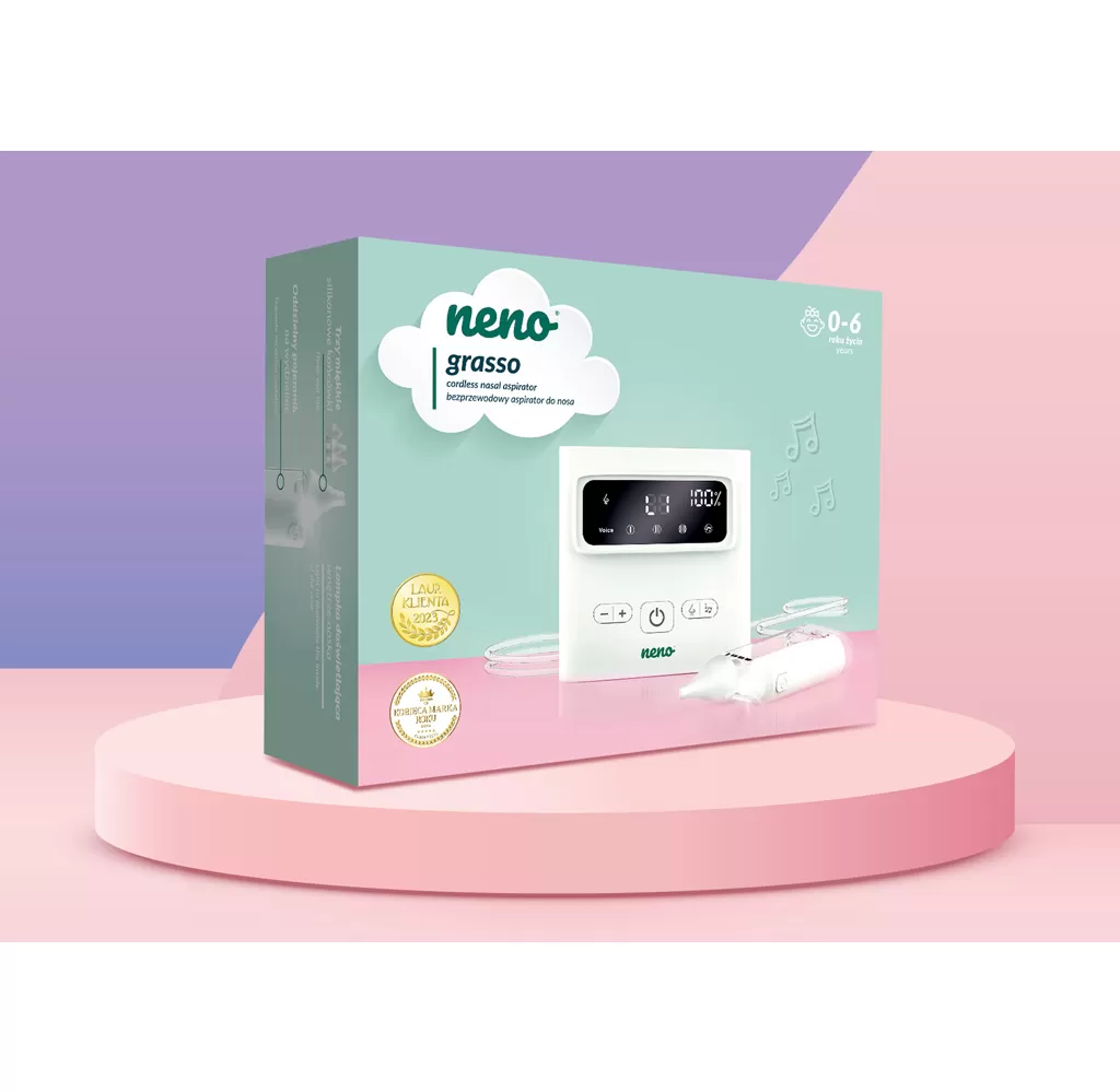 Neno Grasso je bezkabelový elektronický nosní odsavač hlenů pro děti od narození až do 6 let. Profesionální pomocník pro snadné a účinné uvolnění dýchání vašeho dítěte. Šetrně a efektivně odstraňuje hleny různé hustoty, usnadňuje dýchání a zlepšuje pohodu dětí během rýmy i v běžných situacích. Vlastnosti: - Funkce Active Airflow – dynamické proudění vzduchu zaručuje účinné, ale jemné odsávání bez podráždění sliznice - Až 9 úrovní sacího výkonu – přizpůsobení intenzity podle hustoty hlenu, od jemného čištění až po silnější odsávání - Dvě možnosti odsávání – přímý kontakt nebo odsávání z krátké vzdálenosti pro důkladné vyčištění horních cest dýchacích - Tři ergonomické silikonové nástavce – měkké, bezpečné a tvarované podle vývoje dětského nosu - Uklidňující zvuky – dvě melodie a bílý šum pro vytvoření klidné atmosféry během odsávání - Bezdrátový provoz – používání bez kabelů pro úplnou svobodu pohybu doma i venku - Rychlé a praktické USB-C nabíjení – ideální pro rodiče na cestách - Jednoduchá hygiena – samostatná nádoba na hlen a snadno čistitelné díly - Praktický úložný prostor – zásuvka na příslušenství, která pomáhá udržet vše na jednom místě - LED osvětlení – lepší viditelnost při odsávání ve slabém světle - Lehký a kompaktní – pohodlný pro přenášení v tašce nebo batohu - Dlouhodobé použití – spolehlivý od narození až do 6 let Obsah balení: - Elektronický nosní odsavač Neno Grasso - 3 silikonové nástavce - Nádoba na hlen s LED osvětlením - 2 hadičky (50 cm a 100 cm) - 5 filtrů - Kartáček a plochý kartáček na čištění - Pinzeta - USB-C nabíjecí kabel - Ochranné pouzdro - Návod k použití Technické parametry: - Napájení: 5 V / 1 A - Baterie: Li-Pol 3,7 V / 1500 mAh - Sací výkon: Max. 60 kPa ±5 kPa - Proudění vzduchu: 7 l/min - Objem nádoby: 35 ml - Materiál nástavců: silikon - Hlučnost: ≤ 65 dB - Hmotnost: 375 g Rozměry balení: 11,4 × 11,4 × 5 cm Důležité: Před prvním použitím si pozorně přečtěte návod k použití. Po každém použití komponenty vyčistěte a pravidelně sterilizujte. Adresa výrobce: KGK Trend sp. z o.o., ul. Ujastek 5b, 31–752 Kraków, Polsko. info@kgktrend.pl, NIP 678 315 51 46