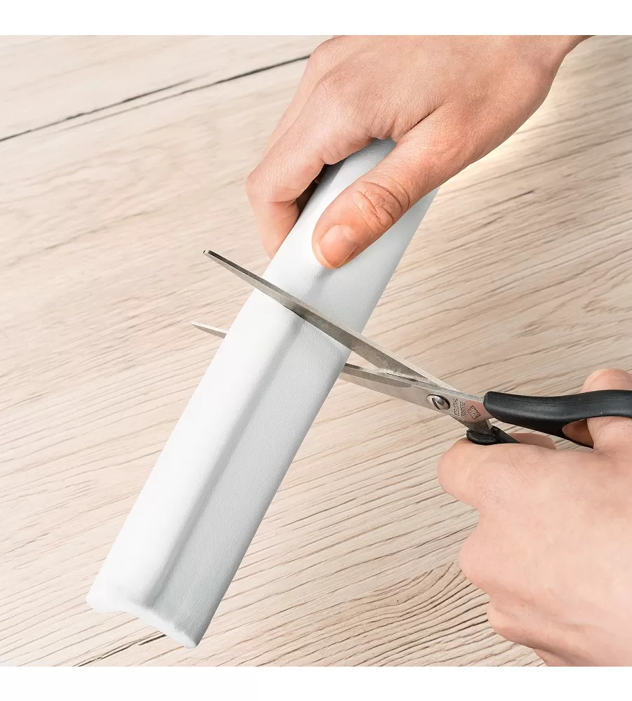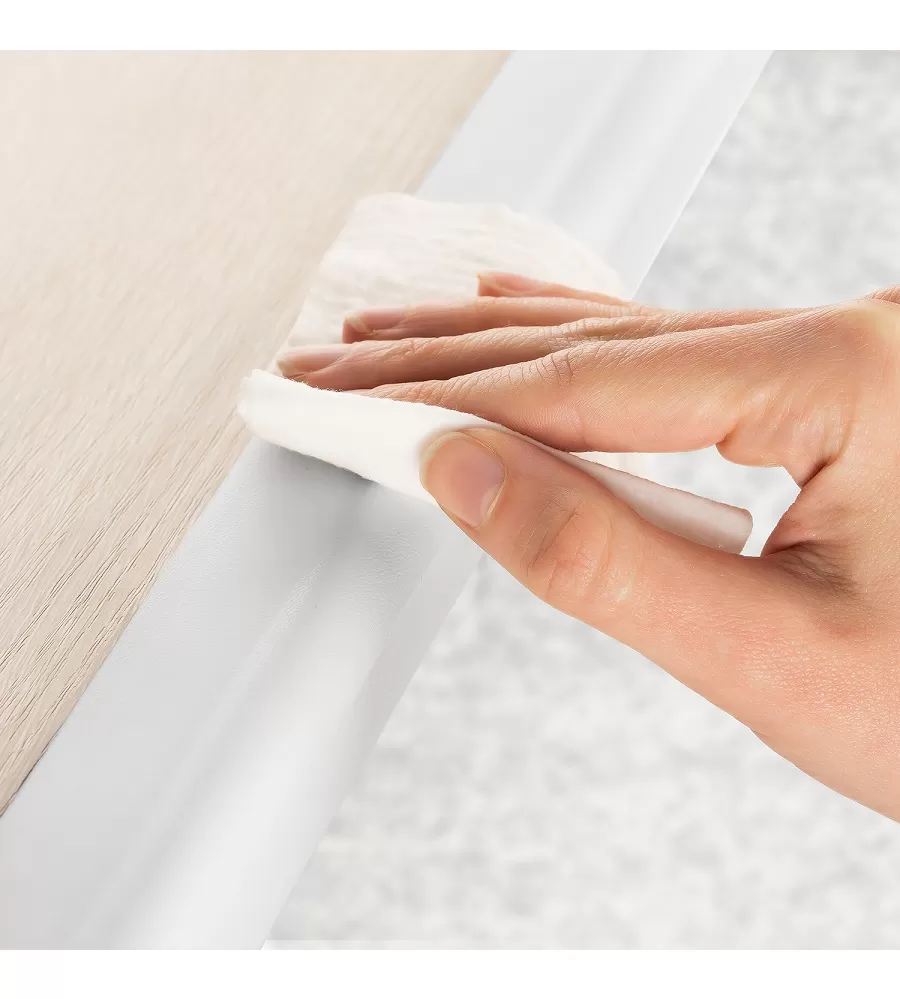 Ochranu hran instalujete v několika krocích. Aby byla zajištěna přesně padnoucí ochrana, lze ochranu hran i lepicí pásku před montáží zkrátit na přesnou délku (obsah: 2x 1m). Pak už jen očistěte hranu, připevněte lepicí pásku na kus nábytku, nasaďte ochranu hran a minutu pevně přitlačte – hotovo. Pokud již není ochrana hran potřeba, lze ji znovu sejmout, aniž by na kusu nábytku zůstaly zbytky.