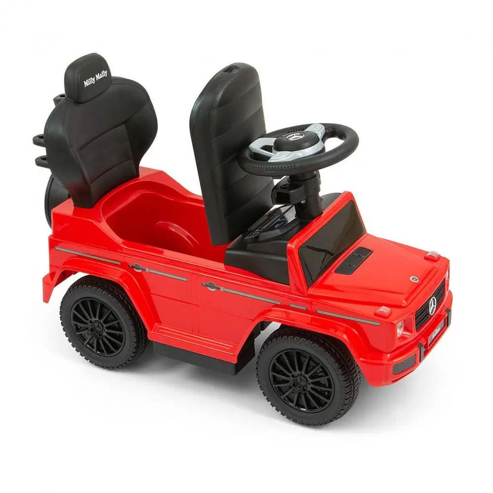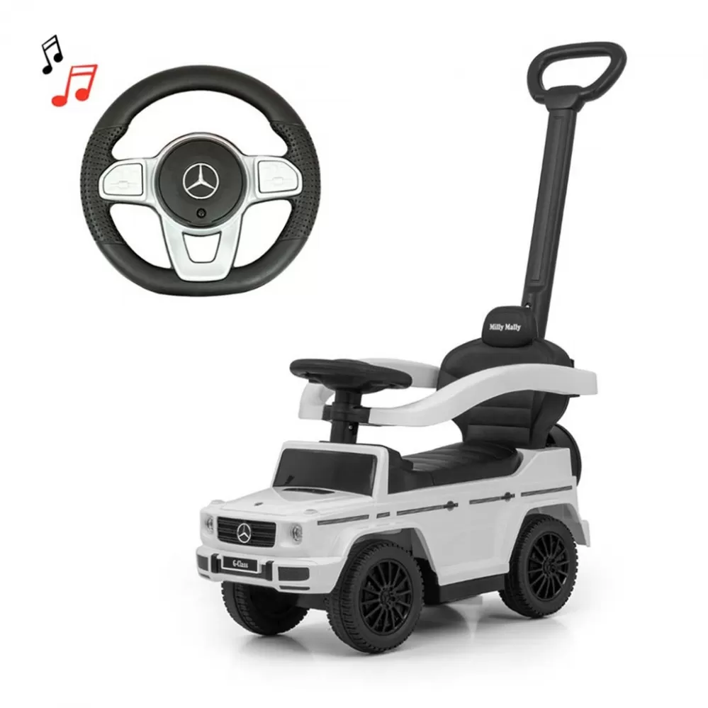 Dětské odrážedlo s vodící tyčí MERCEDES G350d je vyrobeno v licenci koncernu MERCEDES. Váš malý závodník či závodnice se v něm bude cítit jako v opravdovém džípu. Odrážedlo je vyrobeno s důrazem na každý detail a kvalitu použitých materiálů. Jeho vzhled upoutá pozornost nejen každého dítěte, ale i rodiče. Odrážedlo pomáhá rozvíjet motorické schopnosti dítěte a Váš malý závodník či závodnice si s ním užije spoustu zábavy a legrace. Autíčko má na tříramenném volantu tlačítka vydávající různé melodie, zvuk motoru nebo houkačku. Je určeno jak pro nejmenší děti, které už umí sedět, tak i pro děti, které se už naučily chodit. Odrážedlo má otočná přední kola, široké a komfortní sedadlo s úložným prostorem a pohodlnou a zároveň pevnou vodící tyč, kterou lze odrážedlo řídit. Vodící tyč, opěrky na ruce a podnožky lze sundat a tím dítě využije autíčko jako klasické odrážedlo. Baterie nejsou součástí balení (2x AA 1.5V).