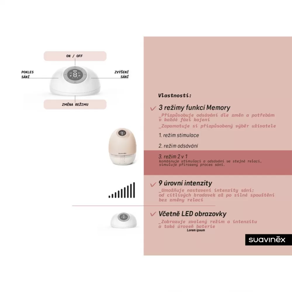 - umožňuje nastavení intenzity sání: jemné pro citlivé bradavky až po silné spouštění bez změny relací