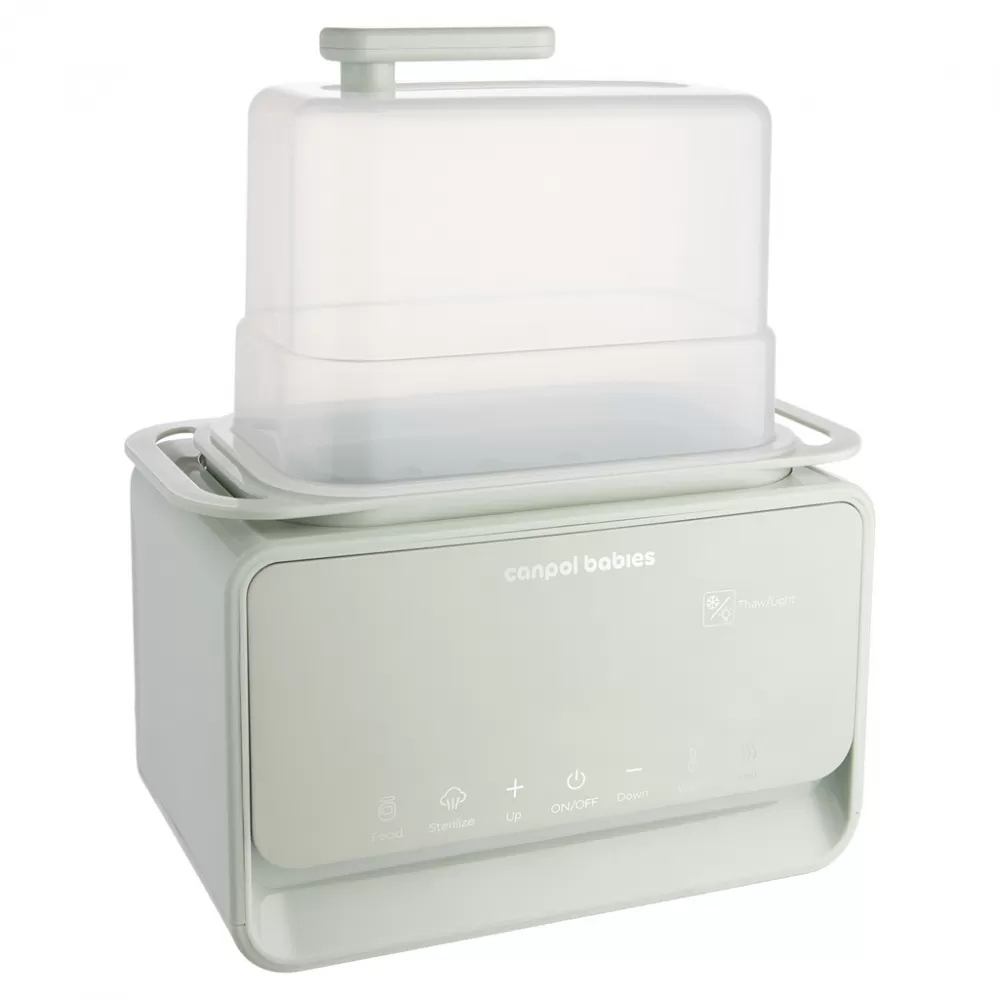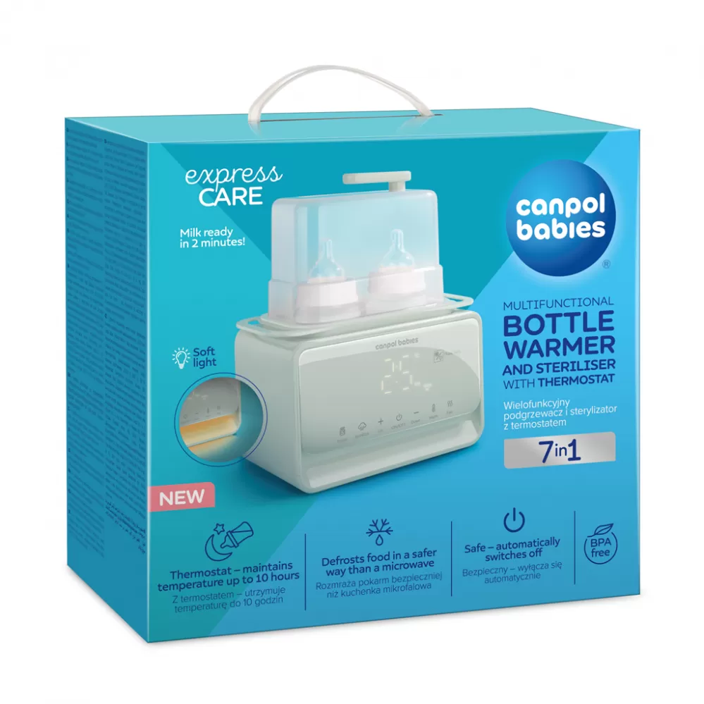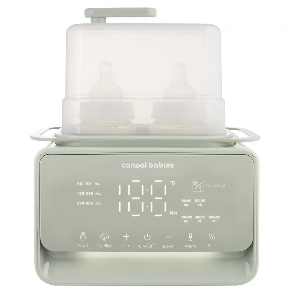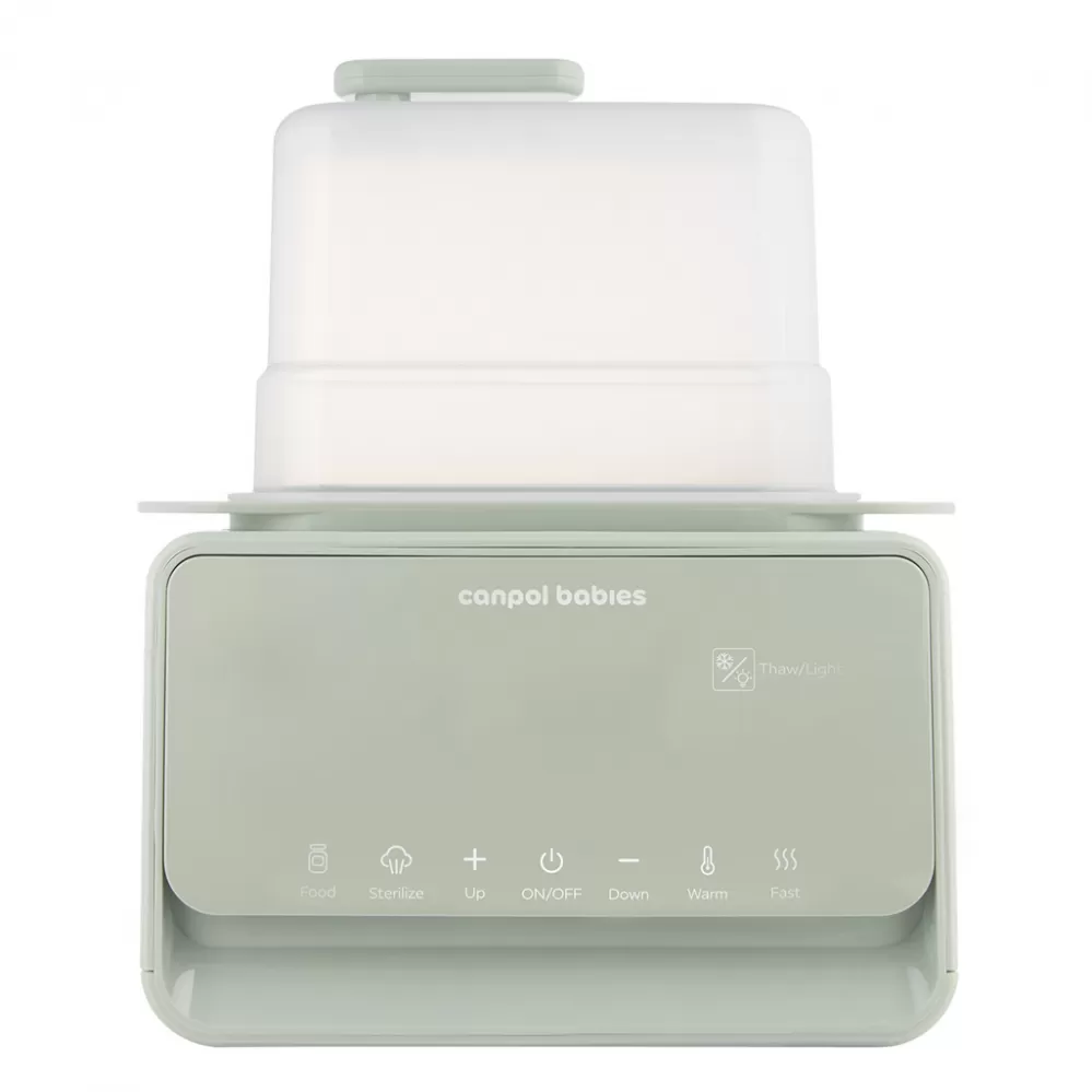 Elektrický ohřívač a sterilizátor lahví Canpol babies 7v1 s termostatem a lampou je multifunkční zařízení, se kterým je příprava jídla pro vaše dítě rychlá a jednoduchá. Nabízí 7 různých režimů: ohřev mléka, ohřev příkrmu/sklenice, rychlý ohřev (za 2-3 minuty), rozmrazování, sterilizace, udržování teploty a funkce nočního světla. Ohřívač rychle ohřeje mateřské mléko do 2-3 minut, v závislosti na velikosti lahve. Díky vestavěnému termostatu udrží teplotu mléka/jídla po celou noc – až 10 hodin, při současném ohřevu dvou lahví. To zajišťuje, že jídlo máte připraveno přesně v okamžiku, kdy ho potřebujete. S termostatem je vše pohodlné a zároveň šetří váš čas. Elektrický ohřívač 7v1 usnadňuje přípravu jídla na ideální teplotu za pouhých několik minut – ať už se jedná o jídlo chlazené nebo v pokojové teplotě. Rovnoměrně rozmrazuje a ohřívá jídlo na požadovanou teplotu v rozmezí 20–40 °C, což zajišťuje bezpečné ohřívání, které je šetrnější než použití mikrovlnné trouby. Navíc sterilizátor Canpol babies dezinfikuje příslušenství pro krmení, dudlíky nebo části odsávaček mateřského mléka za pouhých 10 minut. Kapacita koše je pro dvě kojenecké lahve a několik dudlíků najednou. Decentní noční podsvícení usnadňuje používání zařízení v noci, aniž byste dítě probudili. Nemusíte zapínat jasnější zdroje světla, jako jsou noční lampy nebo baterky na telefonu. Elektrický ohřívač se automaticky vypne, když dojde voda, což zvyšuje bezpečnost, zejména v noci, kdy můžete být unavení, ospalí. Ohřívač Canpol babies umožňuje také rovnoměrně ohřívat skleničky s dětskou stravou a může tak být vaším skvělým dlouhodobým pomocníkem i během rozšiřování stravy dítěte. Hodí se na všechny typy dětských sklenic. Elektický ohřívač a sterilizátor Canpol babies 7v1 je vybaven dotykovým a intuitivním ovládacím panelem, díky kterému se velmi snadno používá. Ohřívač a sterilizátor lahví Canpol babies 7v1 s termostatem a lampou je nezbytným pomocníkem každé maminky krmící z lahve, a proto je nezbytnou součástí každé kojenecké výbavičky. Vlastnosti: - Multifunkční pomocník při rozšiřování jídelníčku a krmení z lahve. - Rychlý ohřev - mléko je ohřáté za pouhé 2 minuty! - S termostatem – udržuje teplotu po dobu až 10 hodin (2 lahve současně). - S decentním nočním světlem – usnadňuje noční použití, aniž byste vaše dítě probudili. - Dezinfikuje dětské příslušenství k lahvím, dudlíky nebo části odsávačky mléka za pouhých 10 minut. - Postupně, bezpečně a rovnoměrně rozmrazuje a ohřívá jídlo. - Rozmrazuje potraviny bezpečněji, šetrněji než mikrovlnná trouba. - Rovnoměrně ohřívá sklenice s dětskou výživou – dlouhodobý pomocník při rozšiřování jídelníčku. - Ohřeje na nastavenou teplotu v rozmezí 20-40°C. - Bezpečný – vypne se automaticky jakmile dojde voda. - Sada obsahuje: víko se stupnicí a rukojetí, koš, základnu spotřebiče a odměrku se stupnicí. - Napětí: 220V~240V, výkon: 500W. - Na výrobek se vztahuje dvouletá záruka platná od data nákupu. - Číslo šarže naleznete na obalu. - Před použitím ohřívače a sterilizátora lahví si pečlivě přečtěte celý návod k použití. - Výrobek je určen pouze pro domácí použití.