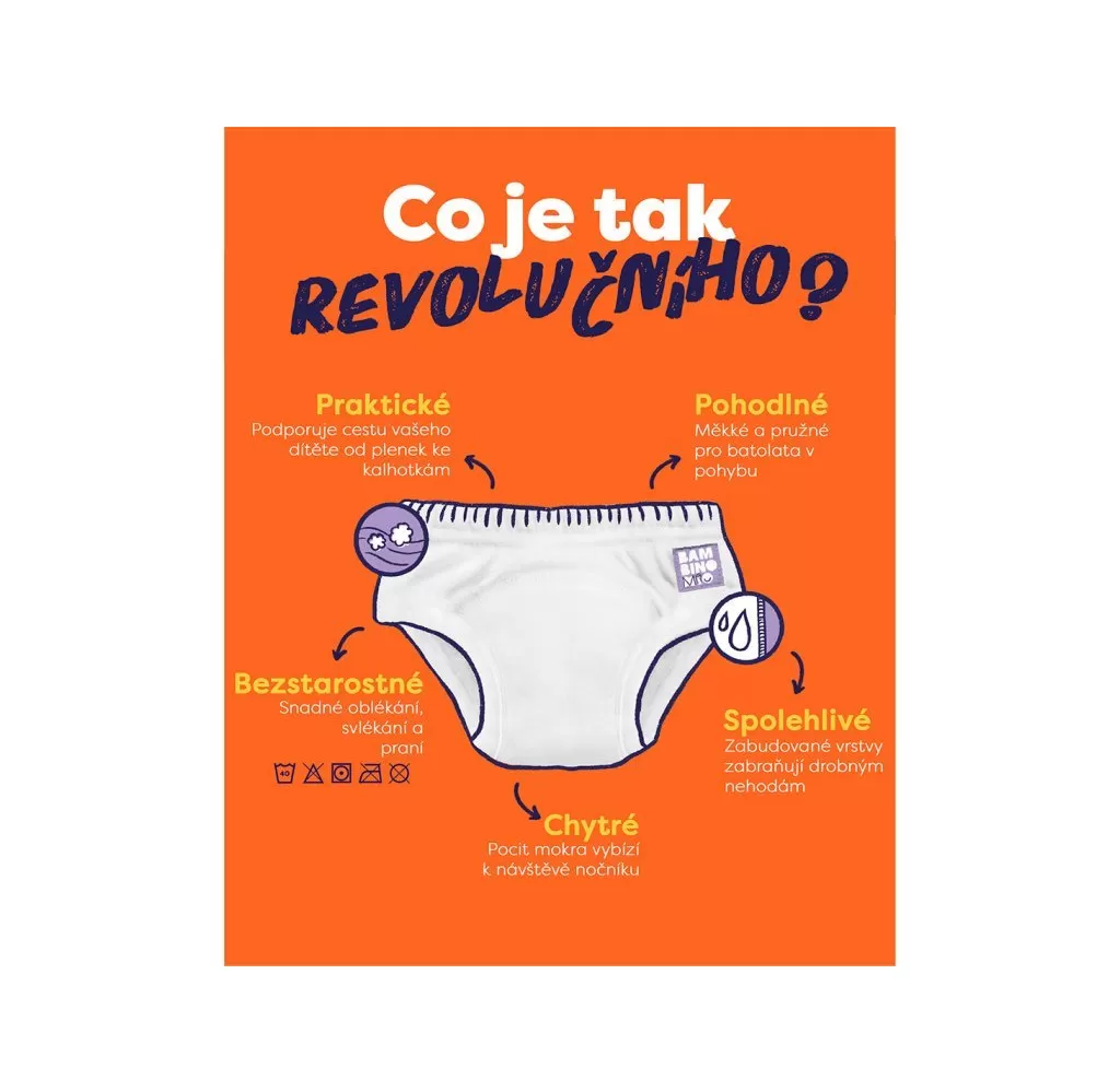 Nepropustná vrstva spolu s absorpční vrstvou částečně chrání před znečištěním okolí. Pomáhají zrychlit proces učení se na nočník avšak nenahrazují plenky. Můžete je dát dítěti jako dárek. Dodají dítěti pocit, že již vyrostlo a plenky nepotřebuje. Nepoužívejte je dříve než je dítě k přechodu na nočník připraveno. Učící plenkové kalhotky sice obsahují absopční vrstvu, která zachytí menší množství moči, ale nenahrazují plnohodnotně vícevrstvou plenku s kalhotkami. Jsou určeny pro dítě, které již přechází na nočník a občas se mu přihodí nepříjemná příhoda. V učících plenkových kalhotkách vlhkost ihned ucítí, může si ji uvědomit a posadit se na nočník. Učící plenkové kalhotky nedávejte dítěti na noc či na spaní a pokud nemáte jinou možnost vložte do nich ještě další vícevrstvou plenku Bambino Mio, která doplní absorpční kapacitu. Před prvním použitím učící plenkové kalhotky minimálně dvakrát předeperte.