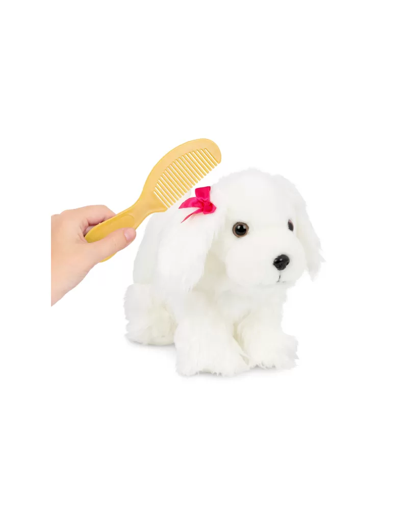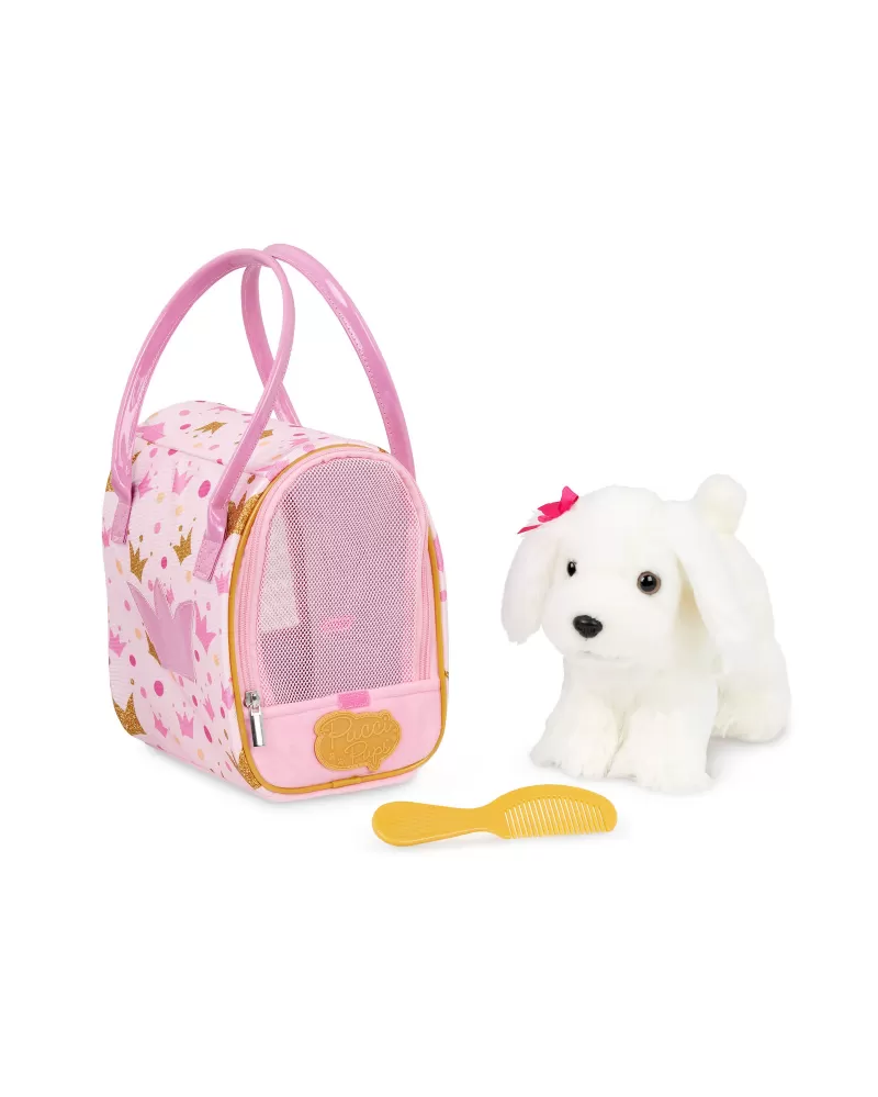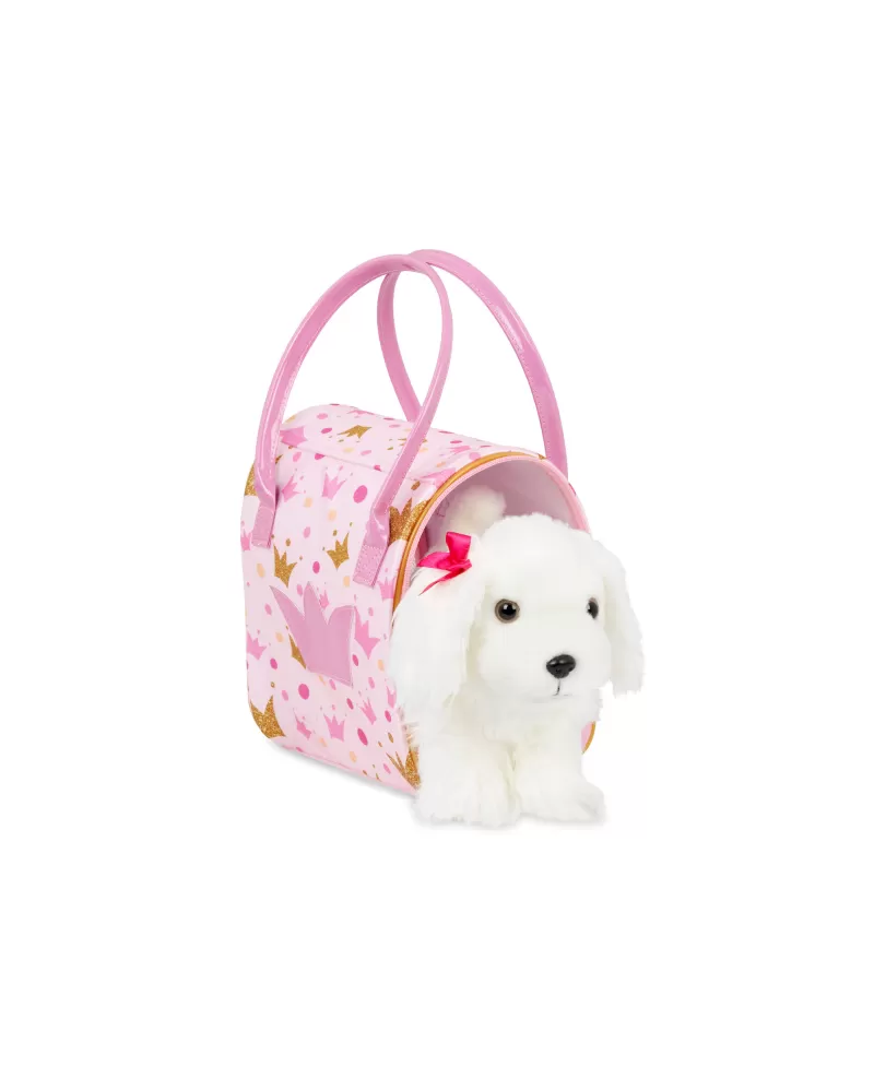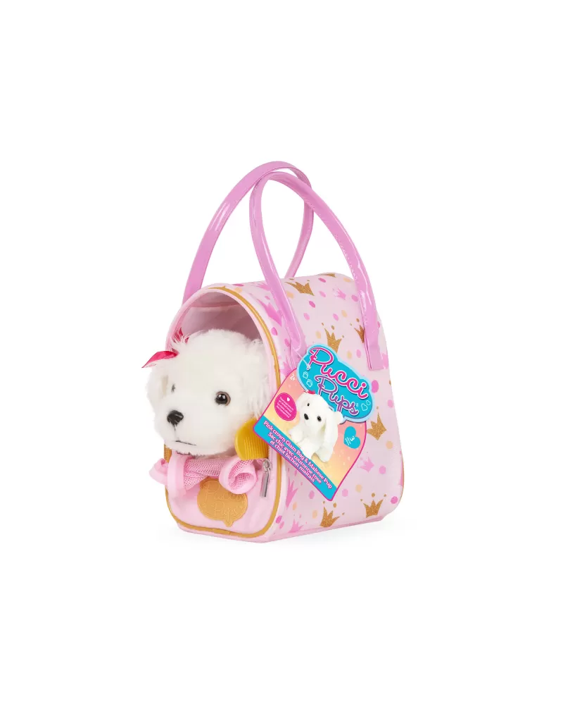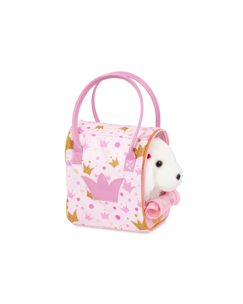 Roztomilé plyšové štěně v kabelce s krásným potiskem je vždy připravené na mazlení i na procházku. Miluje vyčesávání své hebké srsti hřebínkem a díky kabelce si jej vaše dítě může vzít kamkoli. Kabelka má průhlednou přední stěnu ze síťoviny s otevíráním na zip, aby štěňátko při přenášení vidělo na svět.