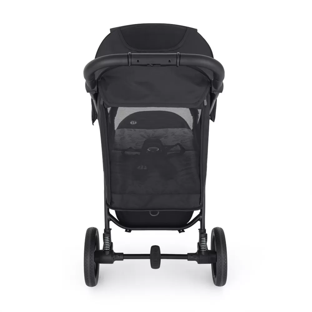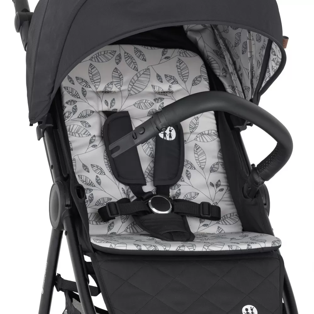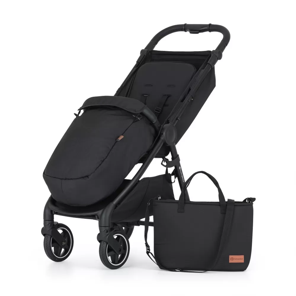 Balení obsahuje: - Konstrukci kočárku v černé barvě s madlem a rukojetí v černé eko-kůži - Přední a zadní celopryžová kolečka - Potah sedadla - Přebalovací tašku - Černý nánožník