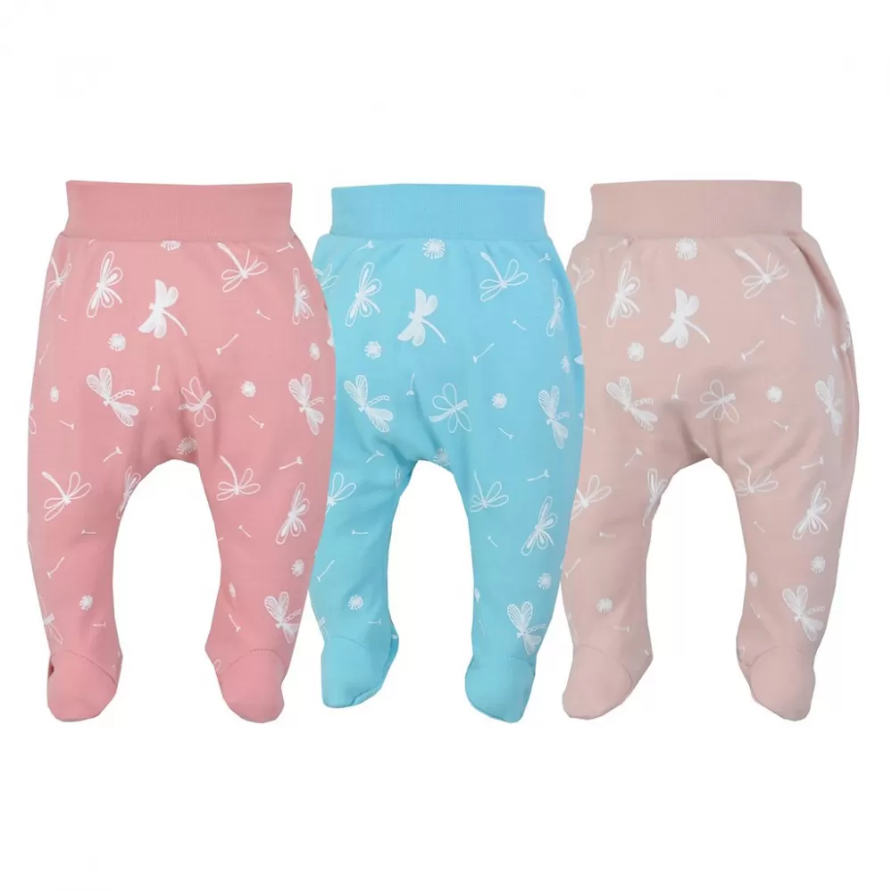 Kojenecké polodupačky Koala Vážka. Barevné polodupačky jsou celopotištěné obrázky, na kterých jsou vážky. Polodupačky jsou vhodné pro miminka už od narození pro svou jemnost a měkkost. V pase mají široký lem, který netlačí na bříško miminka. Složení: 100% bavlna.