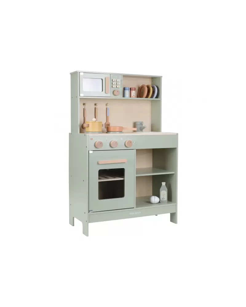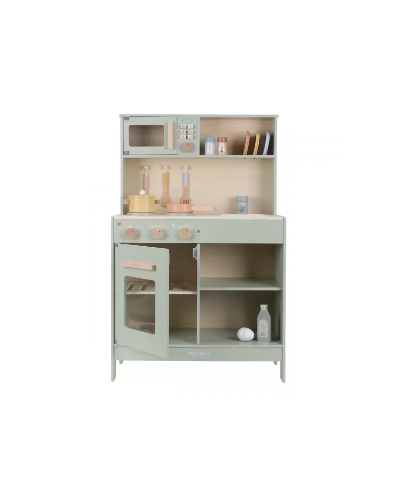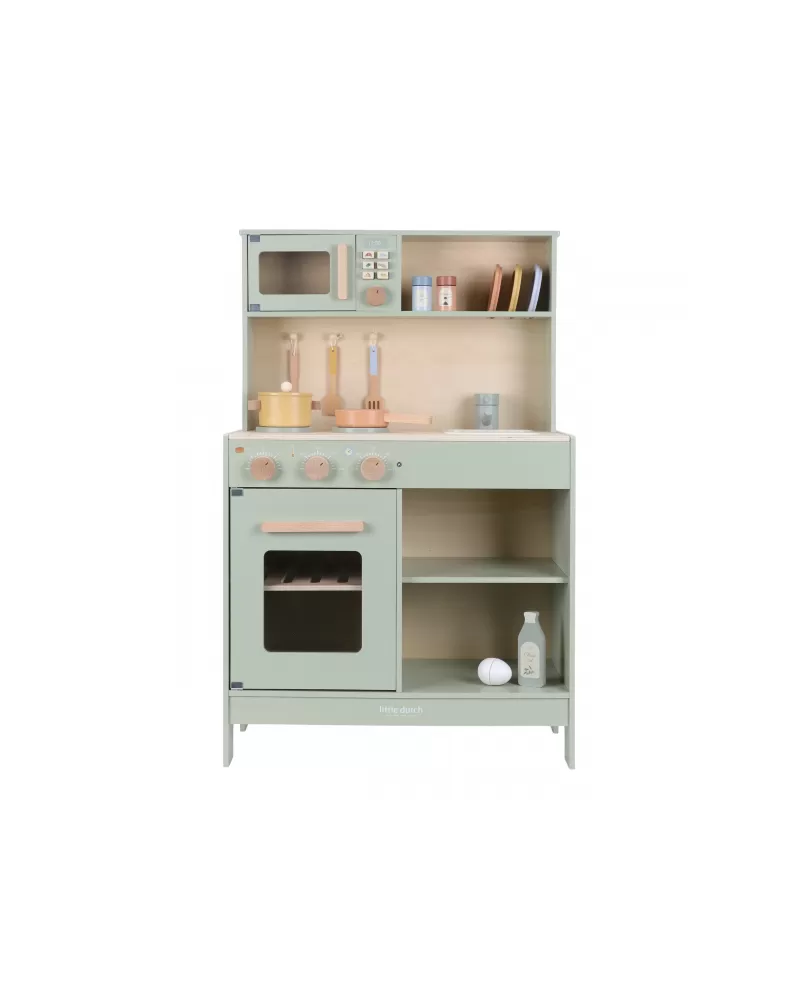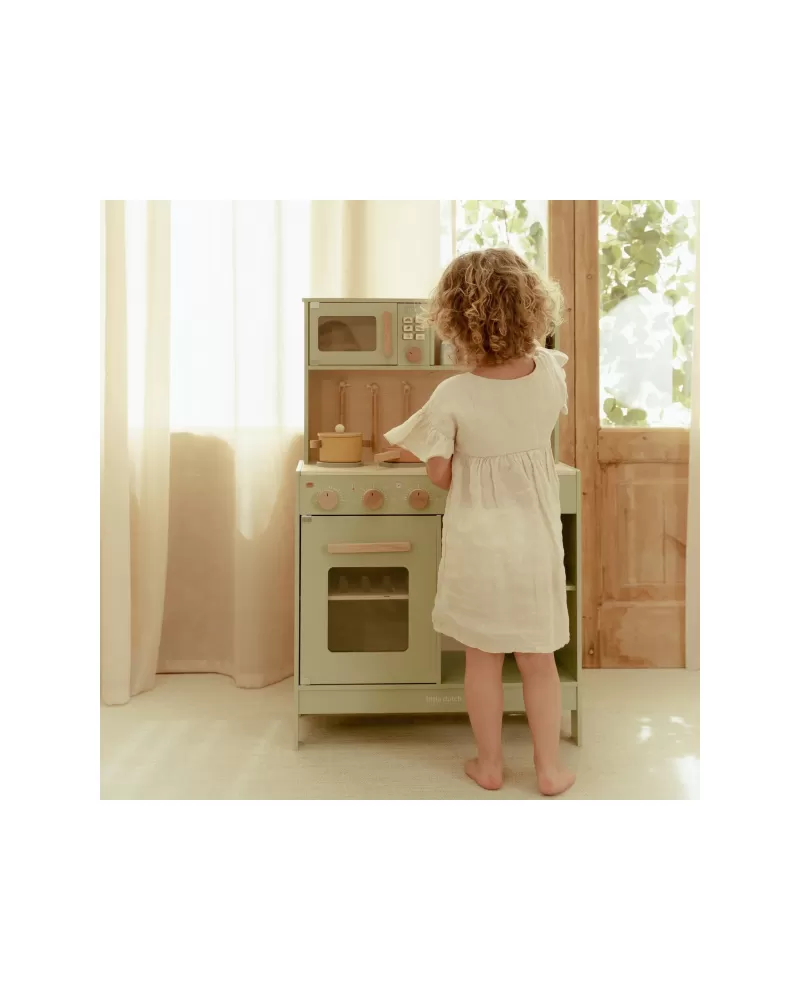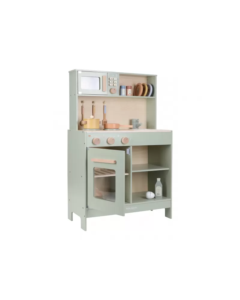 Krásná dřevěná kuchyňka Little Dutch nabízí vše, o čem malý kuchař či kuchařka sní, když vymýšlí nové recepty pro rodinu či své panenky a oblíbené plyšáky. S pánví, hrncem, třemi talířky a sadou kuchyňského náčiní není problém připravit několik chodů najednou. Trouba upeče koláč, na sporáku se uvaří zelenina, mikrovlnka rychle ohřeje, co je potřeba. K dispozici je i olivový olej, vajíčko, sůl a pepř na dochucení. Po práci si kuchař umyje ruce v dřezu. Skříňka nabízí prostor pro uložení potravin.