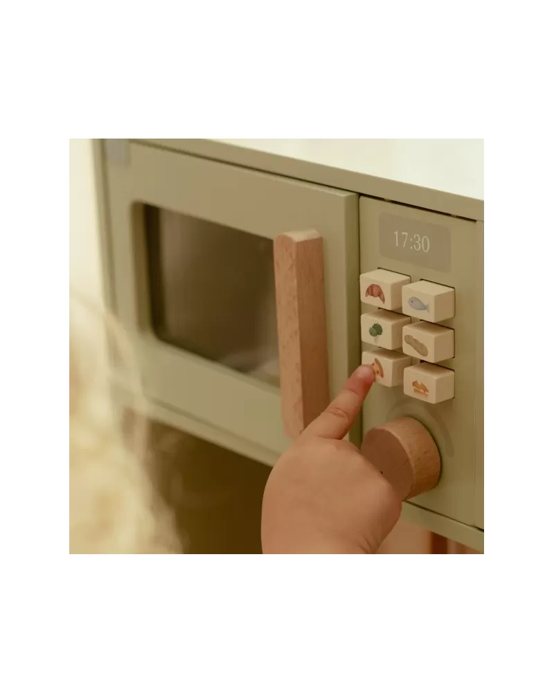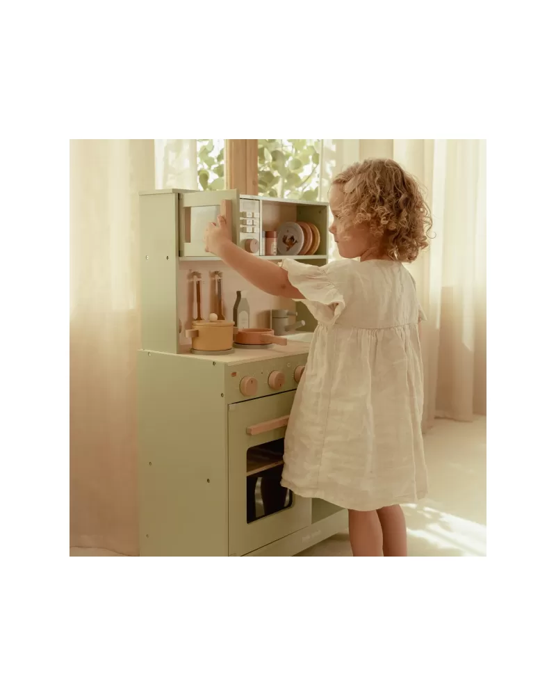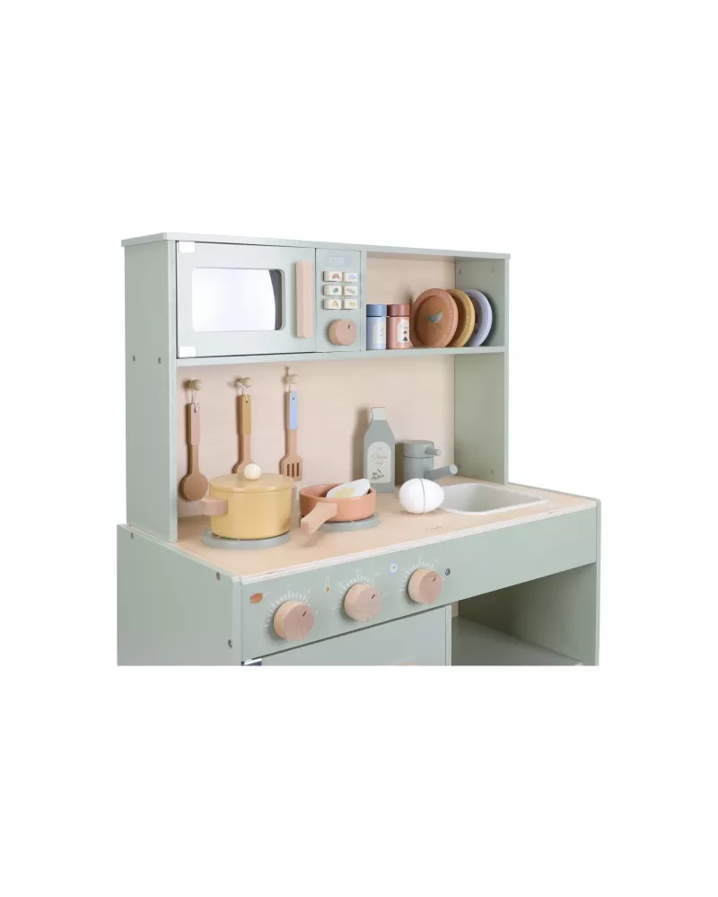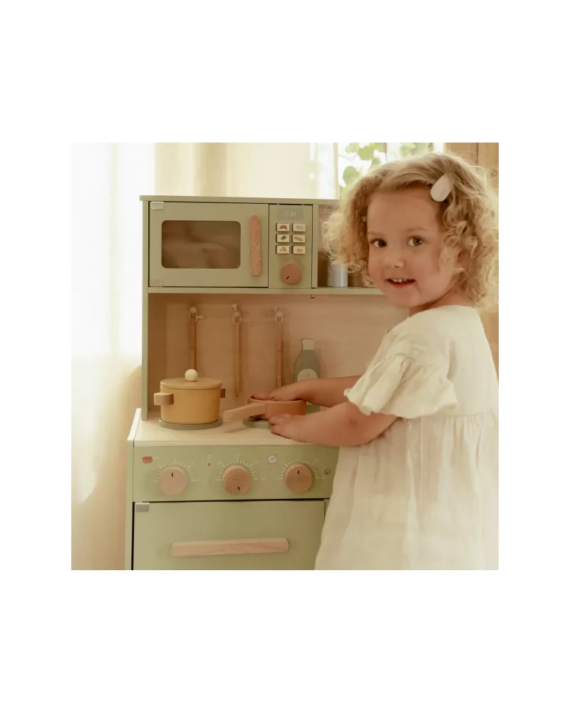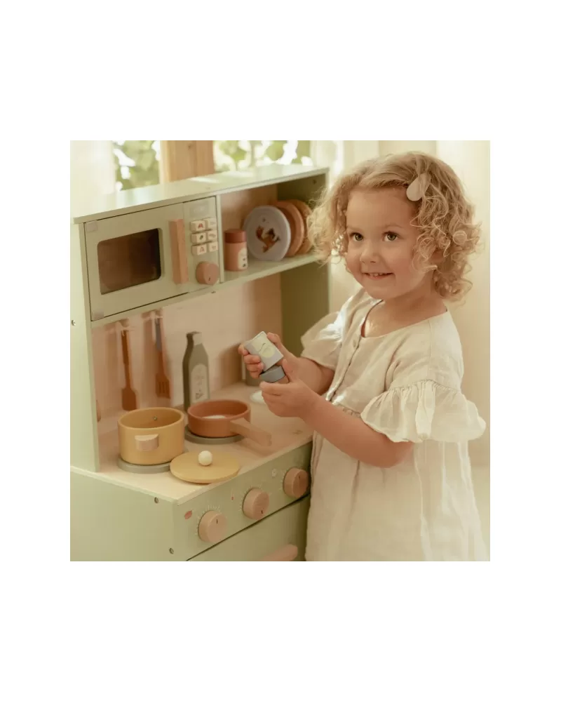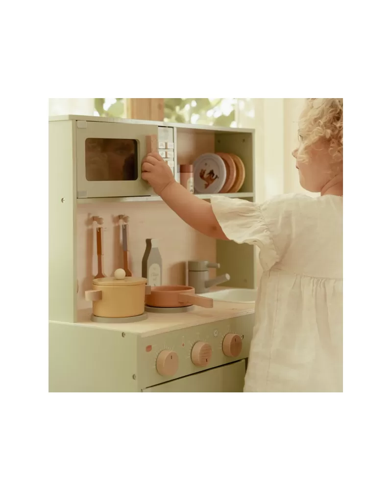 Krásná dřevěná kuchyňka Little Dutch nabízí vše, o čem malý kuchař či kuchařka sní, když vymýšlí nové recepty pro rodinu či své panenky a oblíbené plyšáky. S pánví, hrncem, třemi talířky a sadou kuchyňského náčiní není problém připravit několik chodů najednou. Trouba upeče koláč, na sporáku se uvaří zelenina, mikrovlnka rychle ohřeje, co je potřeba. K dispozici je i olivový olej, vajíčko, sůl a pepř na dochucení. Po práci si kuchař umyje ruce v dřezu. Skříňka nabízí prostor pro uložení potravin.