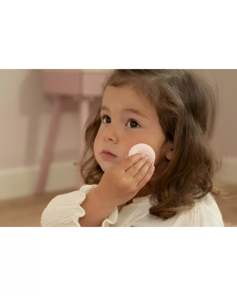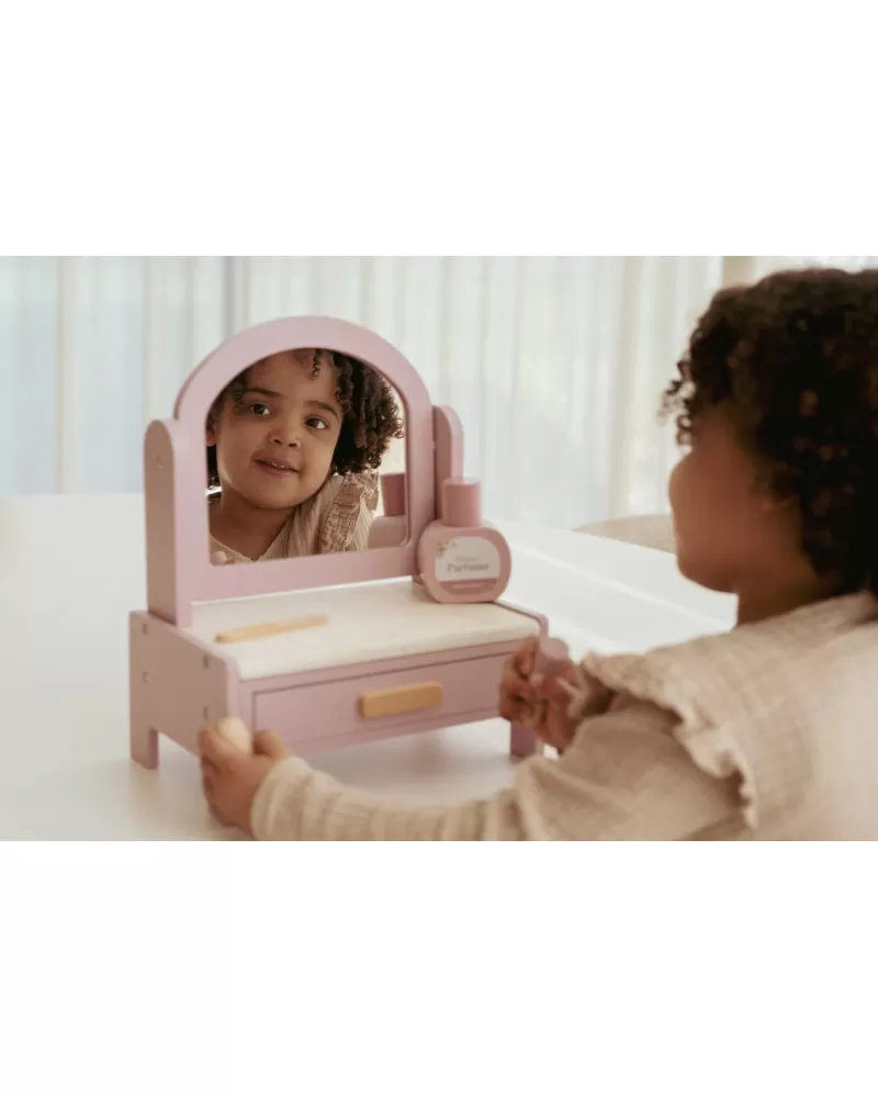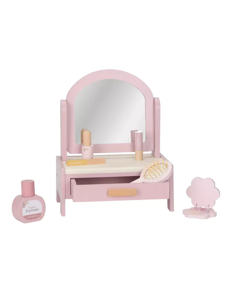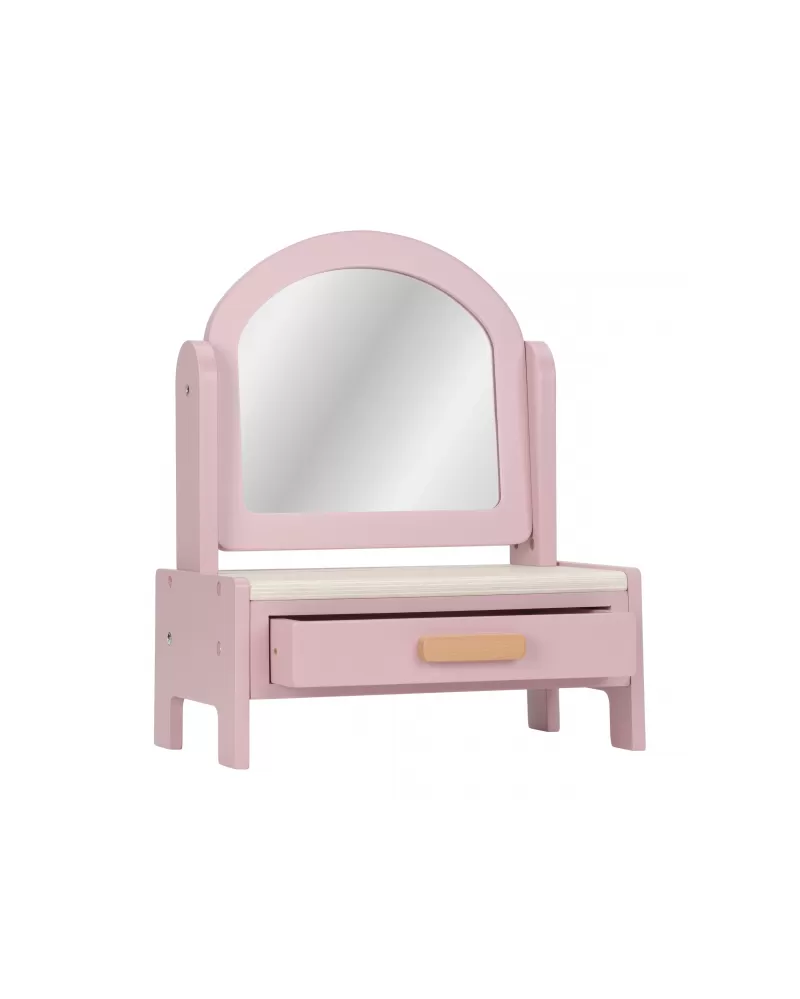 Toaletní stolek s doplňky v dřevěném provedení potěší malou parádnici a stane se i krásnou dekorací v dětském pokoji. Stolek je vybaven otočným zrcadlem, kartáčem na vlasy, parfémem, rtěnkou, očními stíny, pilníkem a lakem na nehty. Zásuvka je ideální pro uložení drobností.