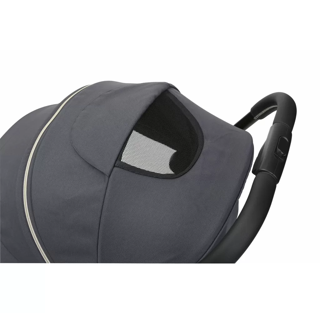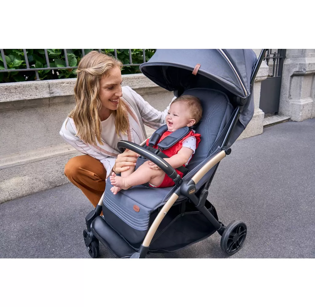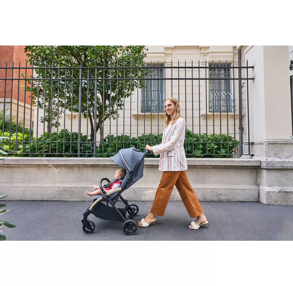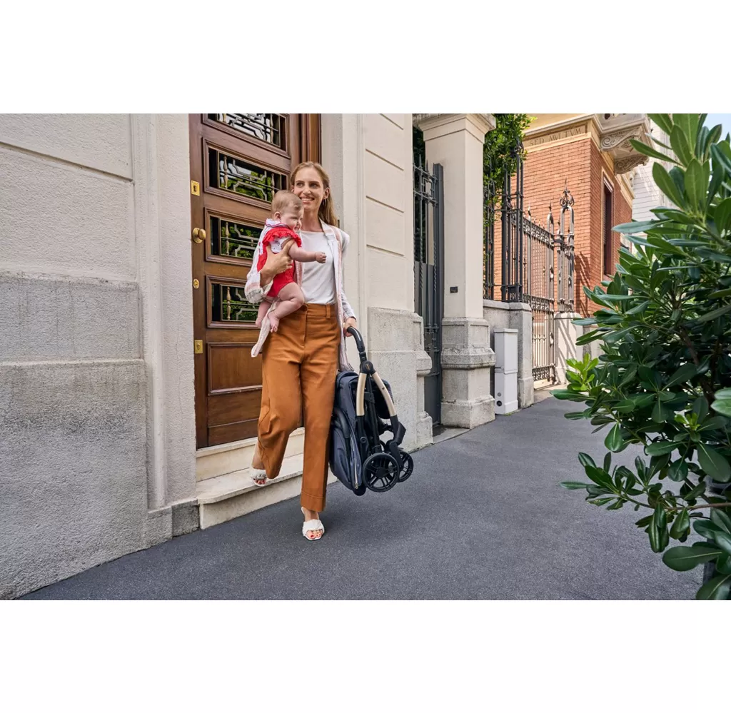 Stačí jeden dotek a kočárek se sám složí! Po složení je opravdu kompaktní a stojí samostatně. Madlo lze také poskládat pro dosažení větší kompaktnosti nebo může být použito jako rukojeť pro přenášení.
