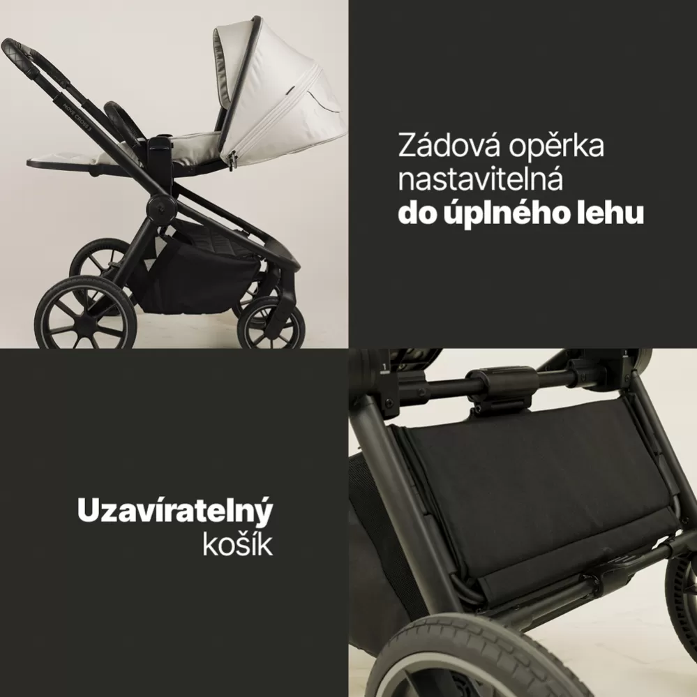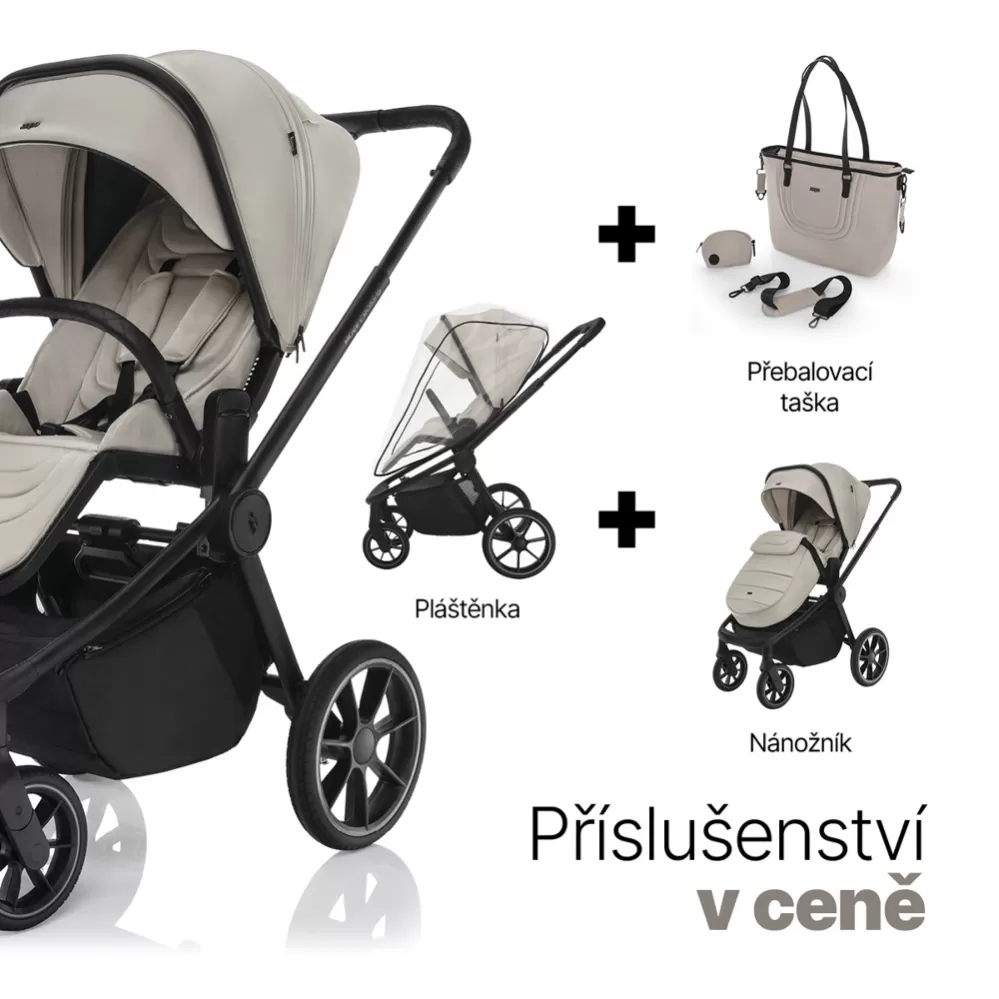 Praktickými detaily jsou magnetická spona pásu, uzavíratelný košík, odklápěcí hrazda a madlo pro snadné přenášení složeného kočárku. Kočárek se snadno skládá a přenáší, a to i jednou rukou. Ve výbavě nechybí pláštěnka, nánožník a stylová přebalovací taška.