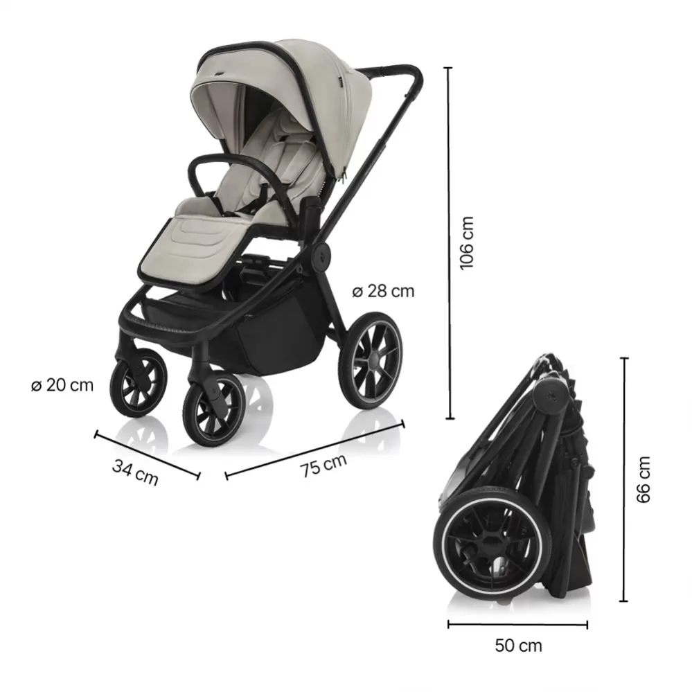 • Rozměry složeného kočárku (š × v): 50 × 66 cm