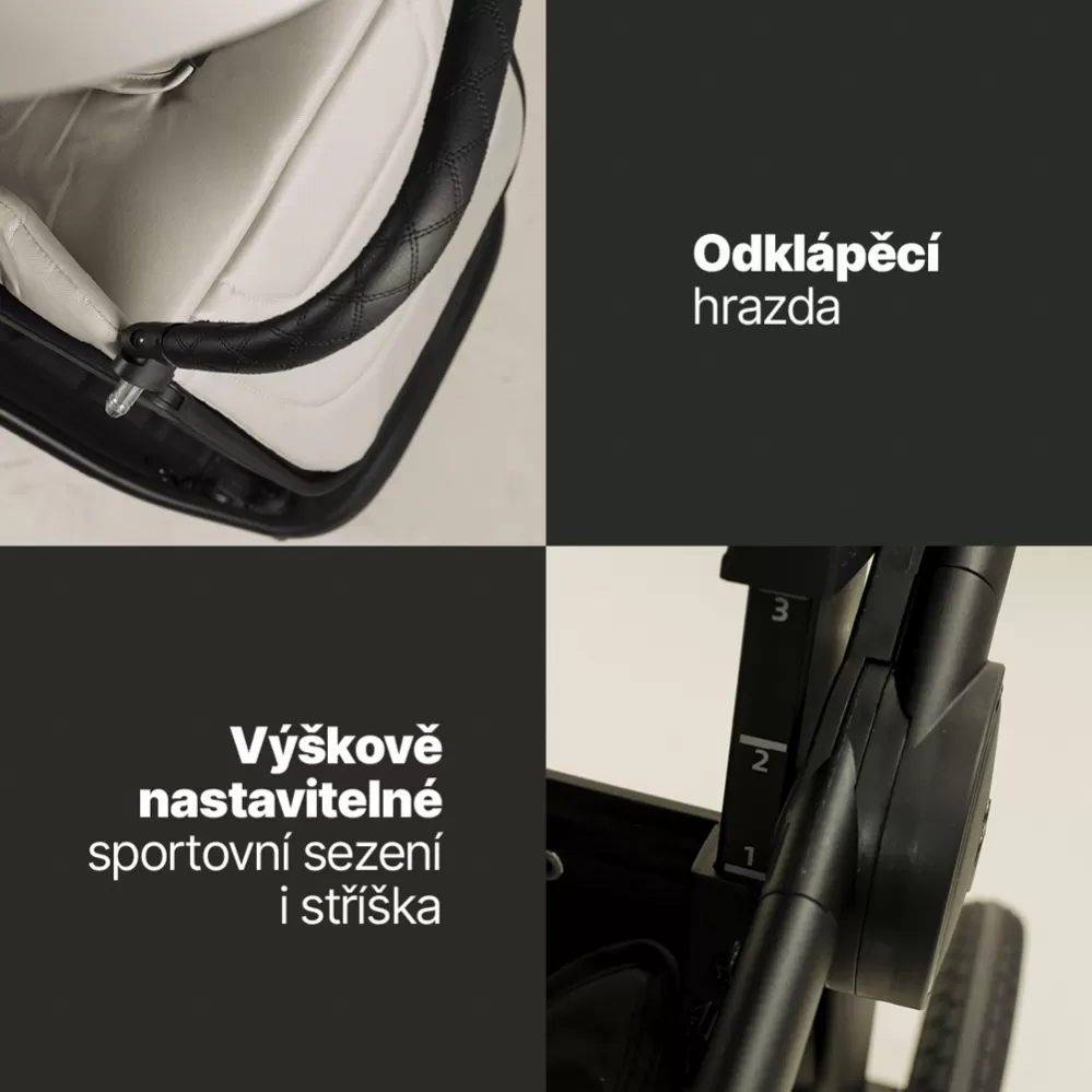 Kočárek umožňuje otočné sportovní sezení, které můžete nasměrovat po i proti směru jízdy. Velkou výhodou je výškově nastavitelné sezení i stříška, každá ve třech úrovních. Přizpůsobí se tak nejen výšce rodičů, ale i růstu dítěte.