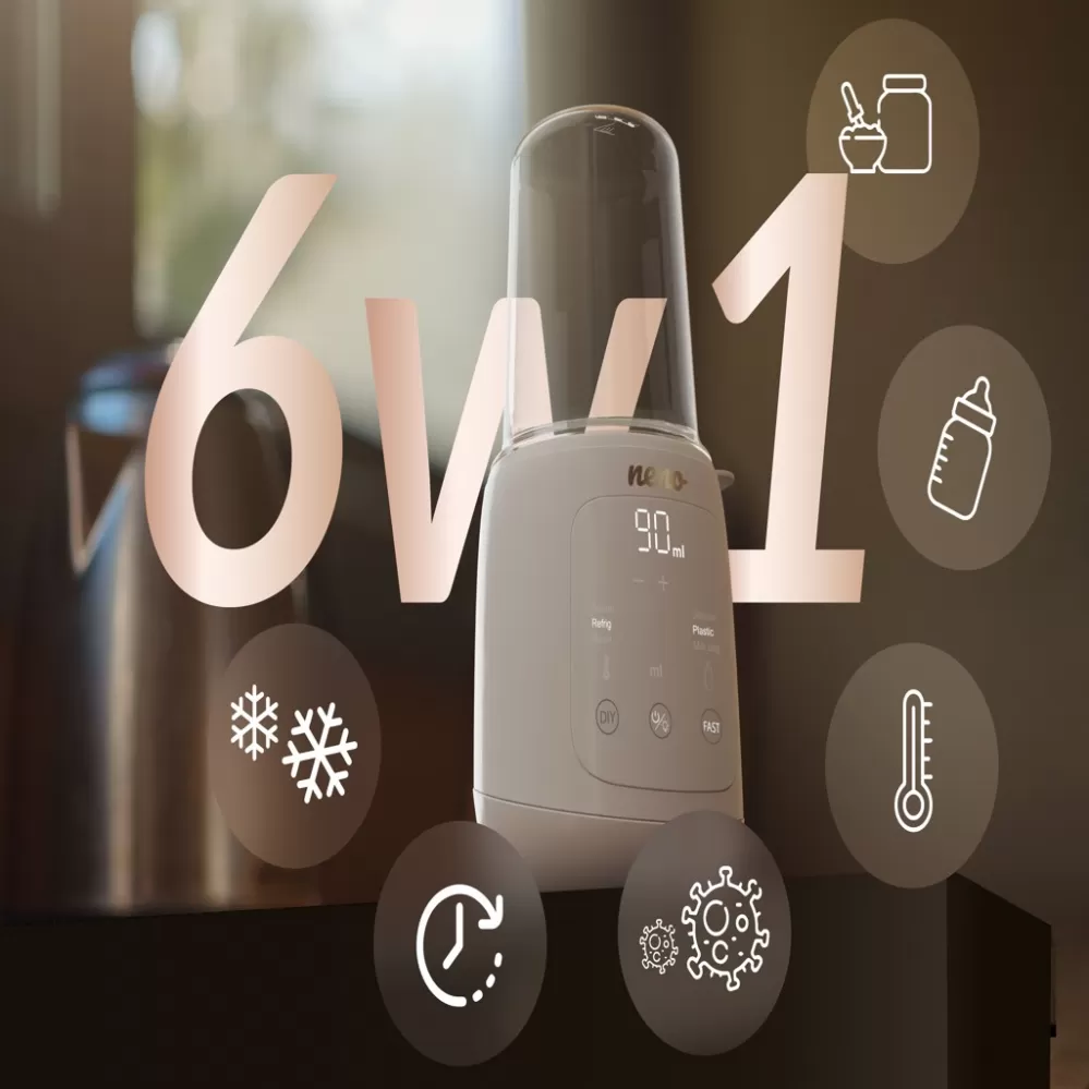 Multifunkční ohřívač a sterilizátor s inteligentním systémem Smart Pro! Neno Tocco je praktické zařízení 6v1 navržené pro rodiče, kteří chtějí připravit jídlo pro miminko rychle, bezpečně a bez stresu. Ohřívač nabízí několik funkcí v jednom kompaktním zařízení – od sterilizace, přes rozmrazování, až po udržování ideální teploty mléka či příkrmů. Elegantní design, dotykový panel a vestavěné LED osvětlení dělají z Neno Tocco skvělého pomocníka i stylový doplněk každé domácnosti. Ideální řešení pro zaneprázdněné rodiče – také jako dárek na baby shower. Vlastnosti: - 6 režimů v jednom zařízení – ohřívání mléka, ohřívání příkrmů, rozmrazování, sterilizace, rychlé ohřívání a udržování teploty. - Smart Pro systém – automaticky nastaví optimální čas a teplotu podle objemu, vstupní teploty a materiálu nádoby (plast, silikon, sáček na mléko). - Přesná sterilizace – eliminuje bakterie z lahví, dudlíků a částí odsávaček. - Bezpečné rozmrazování – ideální pro mateřské mléko v sáčcích i jiné mražené potraviny. - Funkce rychlého ohřívání – vhodná na vodu do umělého mléka nebo příkrmy ve skleničkách. - Udržování teploty – jídlo je vždy připraveno ke konzumaci bez opětovného ohřívání. - Dotykový ovládací panel – intuitivní ovládání s pamětí posledního nastavení. - Vestavěná LED lampička – vhodná pro noční krmení bez osvětlení celé místnosti. - Univerzální kompatibilita – vejde se do něj většina lahví různých výšek a objemů (max. Ø 77 mm). - Kompaktní rozměry a nízká hmotnost - vhodné i do menších kuchyní či na cesty. - Elegantní minimalistický design – ladí s každou kuchyní nebo ložnicí. Obsah balení: - Multifunkční zařízení Neno Tocco - Napájecí kabel (100 cm) - Uživatelský manuál Technické parametry: - Funkce: ohřívání mléka, příkrmů, rozmrazování, sterilizace, rychlé ohřívání, udržování teploty - Vstup: 220–240 V ~ 400 W, 50–60 Hz - Max. průměr láhve: 77 mm - Délka kabelu: 100 cm Rozměry produktu: 13,5 x 13,5 x 24,5 cm Důležité: Před použitím si prosím pozorně přečtěte pokyny. Pokud je výrobek poškozen, nerozebírejte jej sami. Obraťte se na autorizovaný servis. Výrobek není hračka. Adresa výrobce: KGK Trend sp. z o.o., ul. Ujastek 5b, 31–752 Kraków, Poland. info@kgktrend.pl, NIP 678 315 51 46