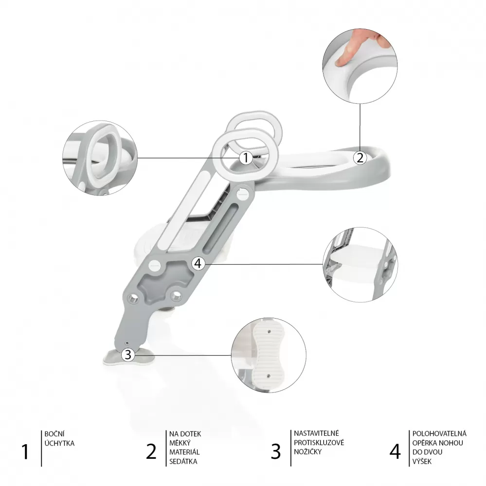 Schůdky jsou vhodné pro děti od 1 roku a díky výškové nastavitelnosti porostou s vaším dítětem až do doby, kdy už je nebude potřebovat. Pevná konstrukce zaručuje, že se dítě bude při šplhání i sezení cítit bezpečně. Nohy jsou vybaveny speciální protiskluzovou vrstvou, která poskytuje pocit stability a opory. Součástí schůdků je také měkký a pohodlný sedák, který slouží jako redukce na klasický záchod. Anatomický tvar sedáku spolu s vyvýšenou zadní stranou dokonale zabraňuje nechtěnému znečištění.