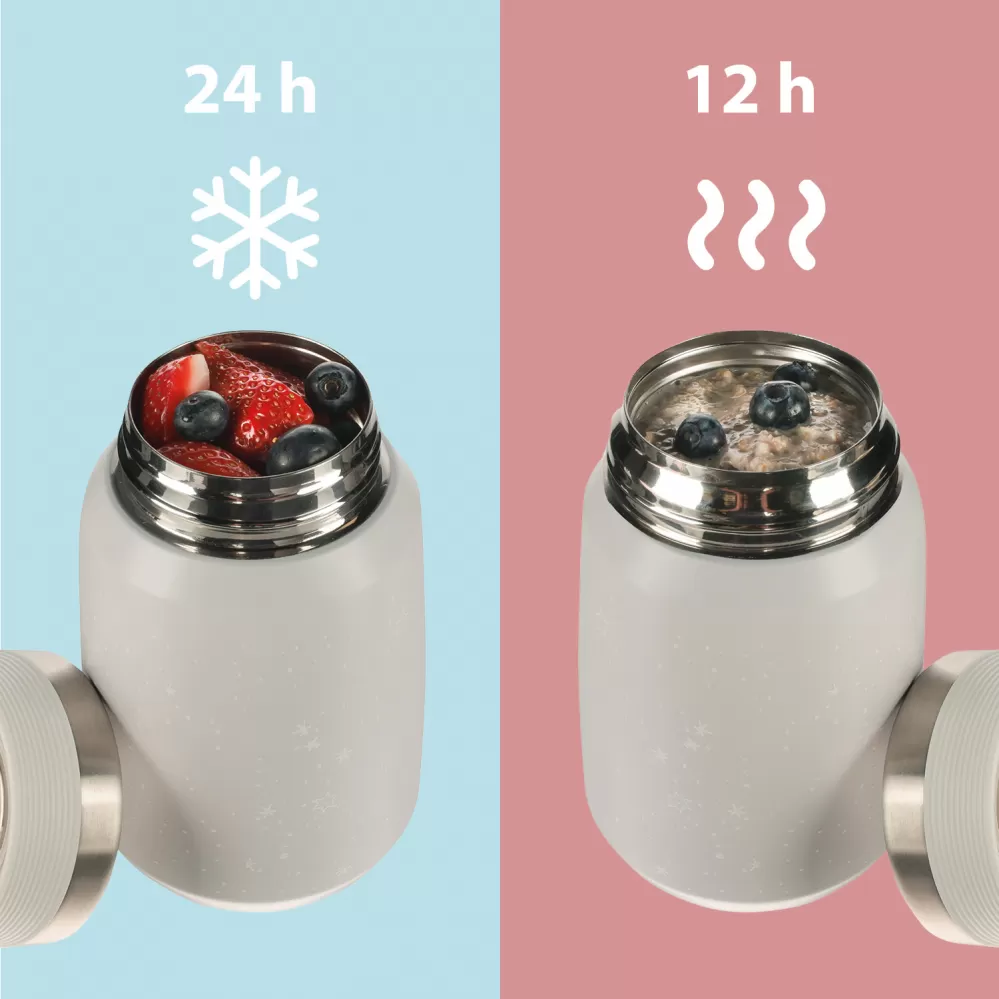 Kvalitní termoska na jídlo a příkrmy o objemu 500 ml uchovává horké jídlo až 12 hodin, studené až po dobu 24 hodin. Je vyrobena z kvalitní nerezové oceli, která je odolná vůči korozi. Těsné víčko zajišťuje, že termoska neprotéká. Díky vakuové izolaci se termoska při naplnění horkým obsahem nezahřívá z venku.
