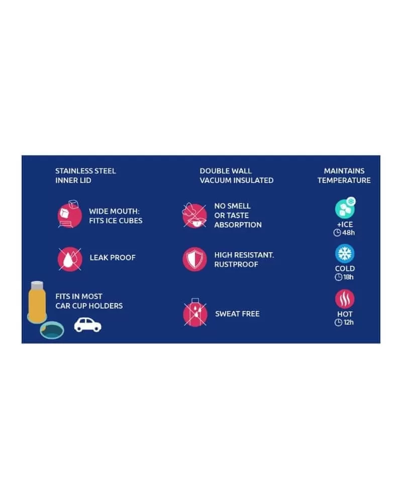 Termoska Quokka Solid z vysoce kvalitní dvoustěnné oceli se spolehlivým, 100% těsnicím uzávěrem udrží váš nápoj dle potřeby teplý či studený. Široké hrdlo umožňuje vložení kostek ledu. Termoska udrží teplotu studeného nápoje s ledem až 48 hodin, studeného nápoje až 18 hodin a teplého nápoje až 12 hodin.