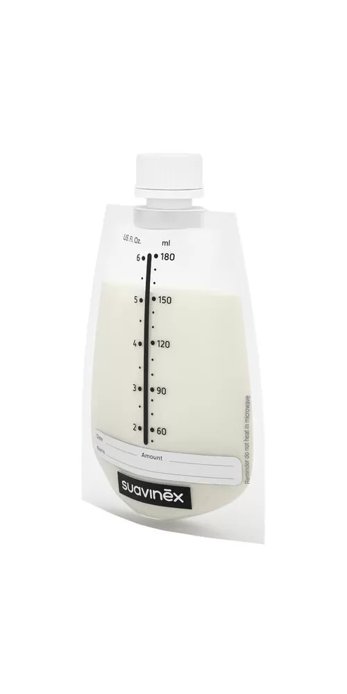 Jednorázové sáčky Suavinex s postranní nálevkou umožňují jednoduché skladování mateřského mléka po jeho odstříkání. Naplněné sáčky mohou být uskladněny v lednici či v mrazáku a díky svému širokému průměru získávají důležitou stabilitu. Svou malou velikostí jsou velmi skladné a mohou být naskládané jednotlivě na sebe. Boční nálevkou lehce, hygienicky a beze zbytku do poslední kapky mateřské mléko vylijete do kojenecké láhve. Na štítek sáčku máte možnost zaznamenat datum jeho otevření a uzavření. Sáčky jsou před-sterilizované a není nutné je opět před použitím umývat nebo sterilizovat.