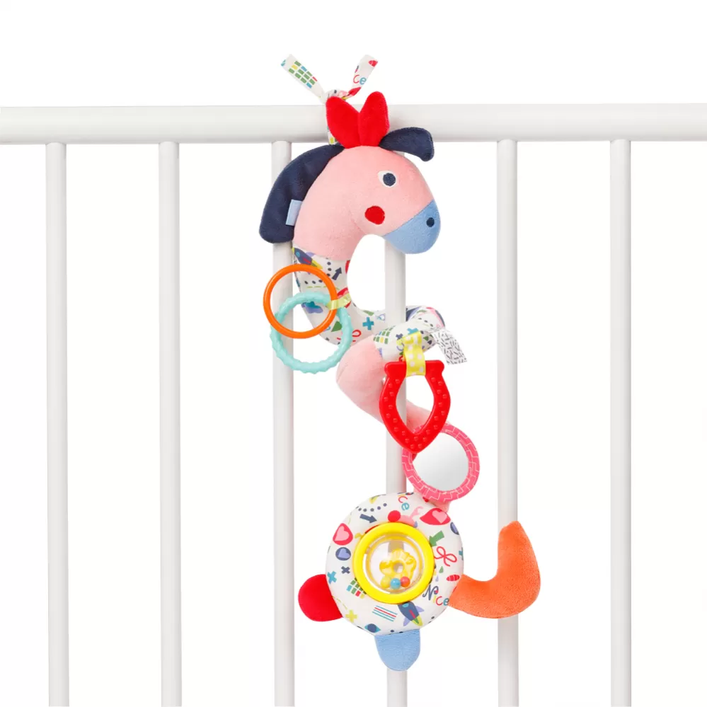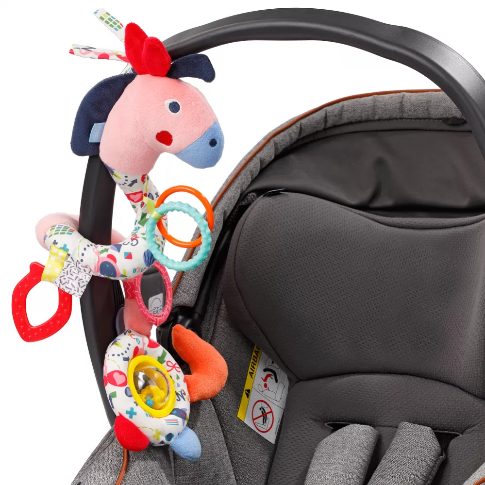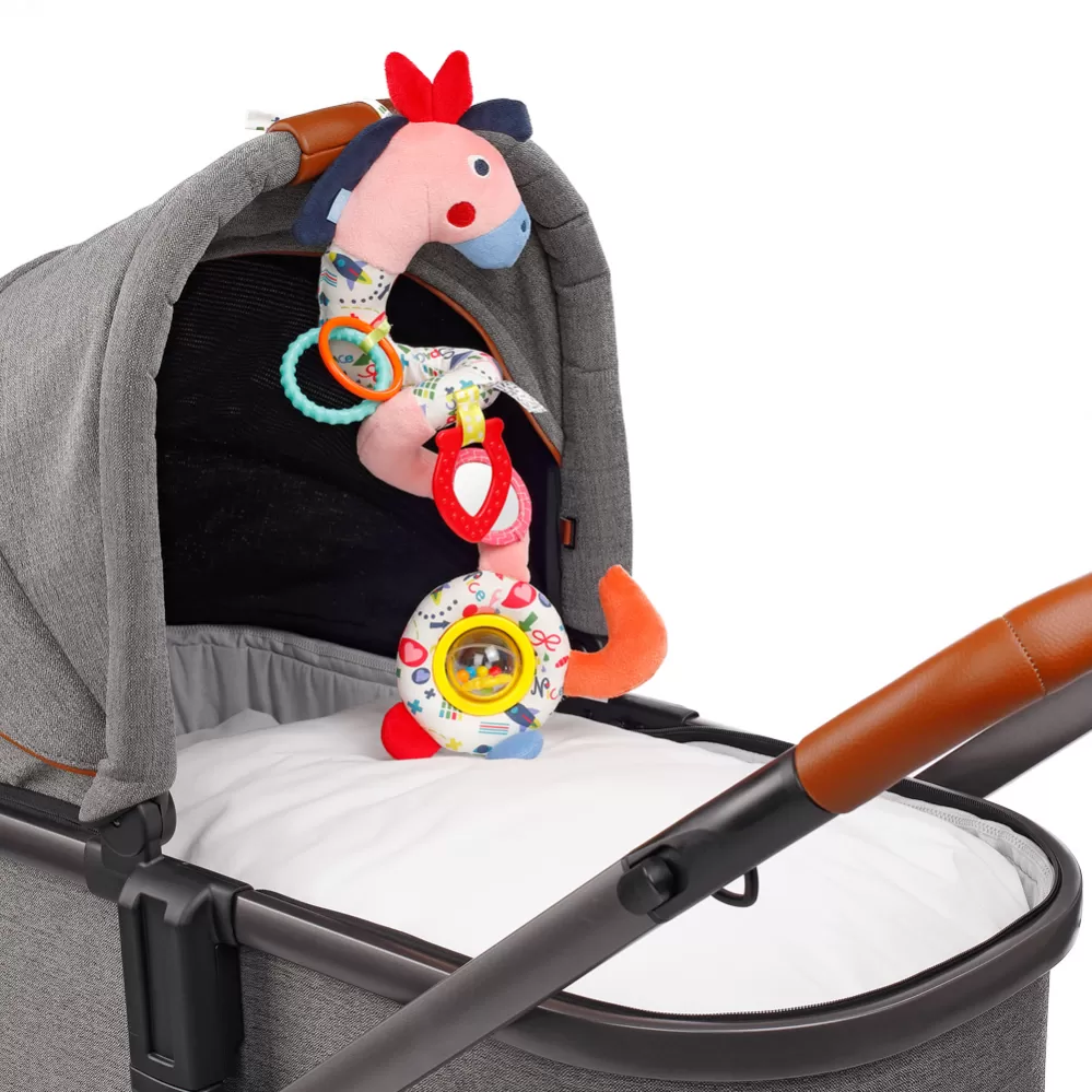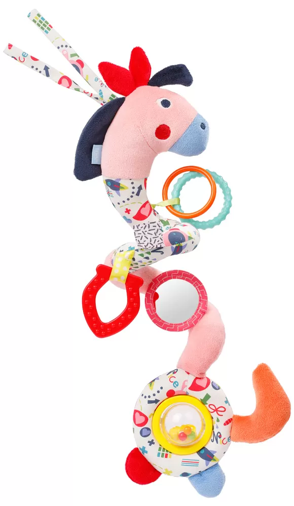 Multifunkční spirálový kůň z kolekce COLOR Friends nabízí celou řadu možností hraní doma i na cestách. Hračka do kočárku zve dítě k pozorování, hraní a uchopení s pestrou kombinací funkcí a barev a je také skutečným poutačem. Skrytý zvířecí zvuk, skřípavý papír, dva uchopovací kroužky, měkké hryzátko, malé zrcátko, pískot a velká kuličková rachotka trénují koordinaci ruka-oko, sluch a hmat, stejně jako motoriku dítěte. Se dvěma popruhy je vzdělávací hračka rychle a pružně připevněna k sedačce, kočárku, postýlce a ohrádce. Každé dobrodružství je tak vzrušujícím zážitkem!