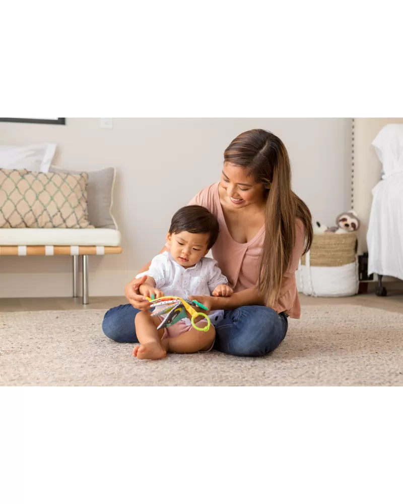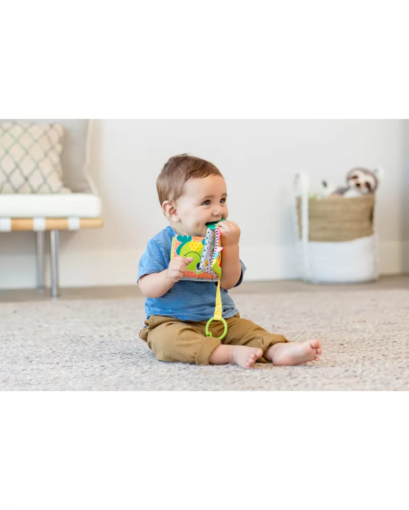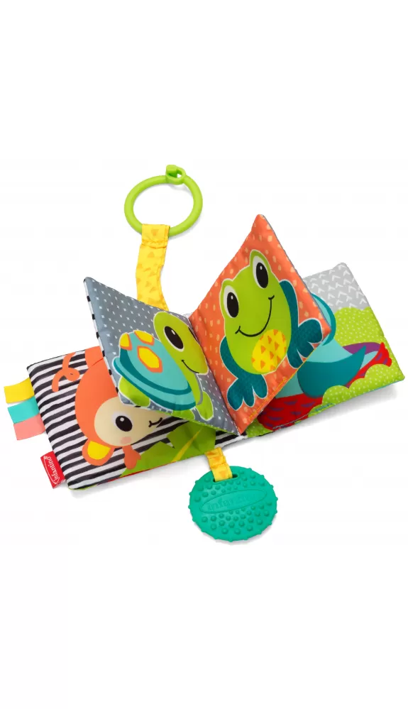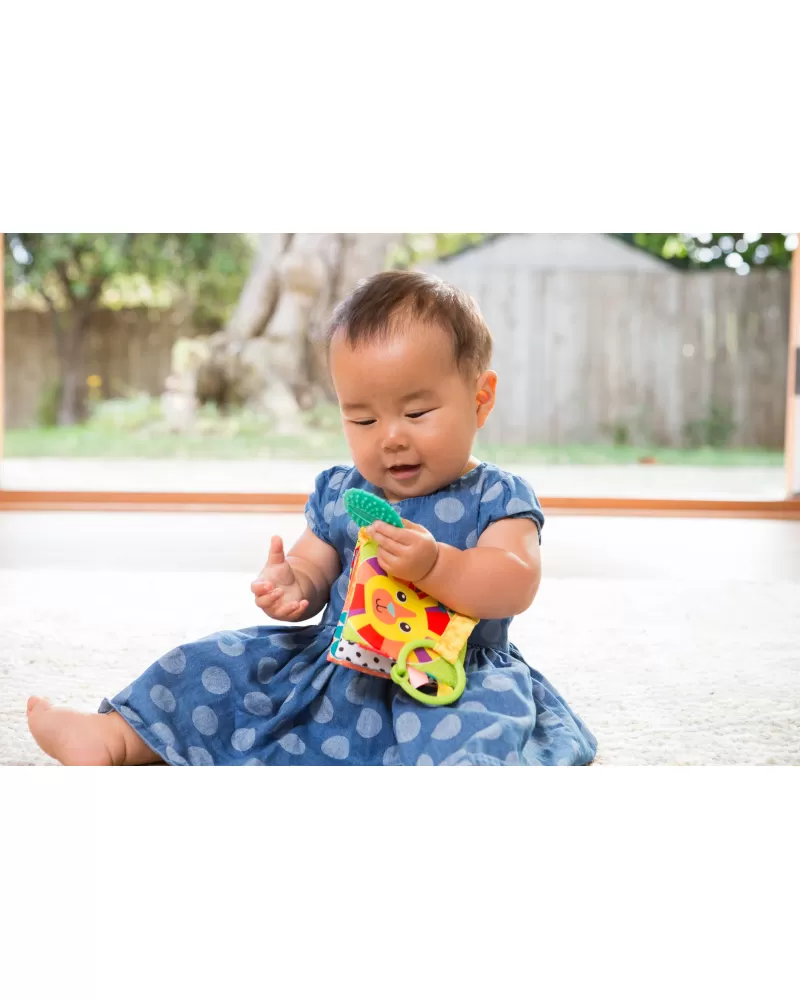 Textilní kniha s výraznými obrázky zvířátek ve vysoce kontrastních barvách pomáhá rozvíjet zrak dítěte. Nabízí dítěti různorodé textury pro zkoumání včetně kousátka, které pomůže dítěti při prořezávání prvních zoubků.