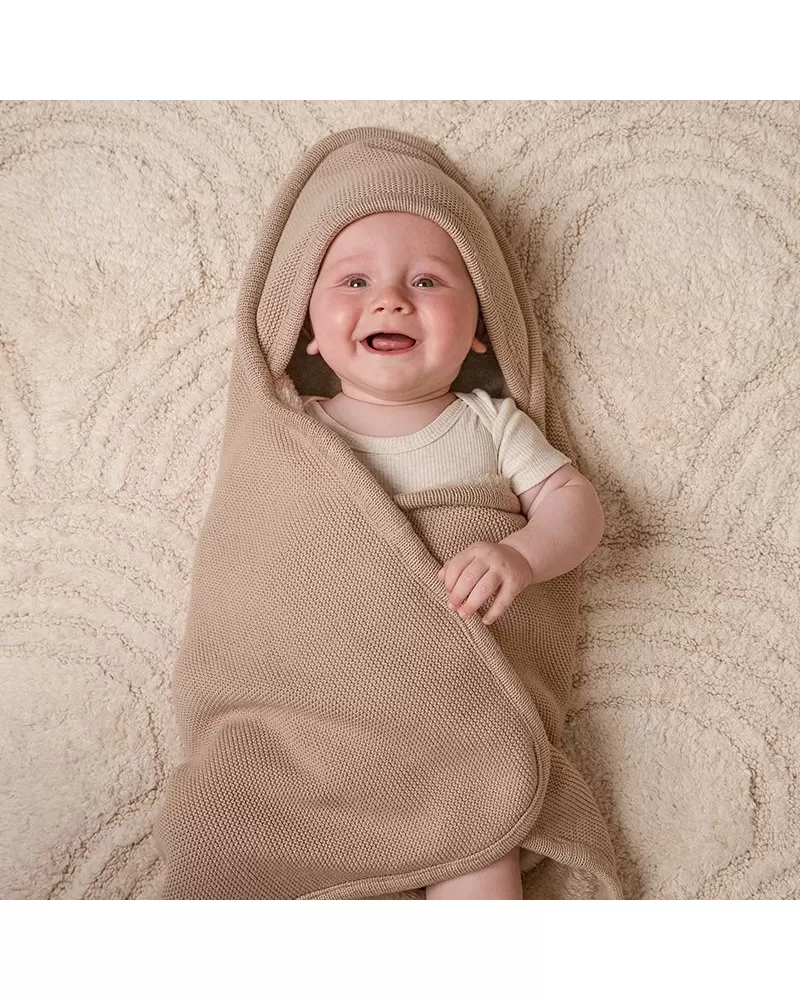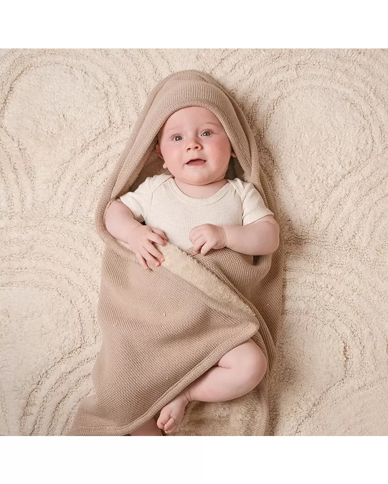 Pletená deka z organické bavlněné pleteniny a jemného fleecu je ideální pro zavinutí miminka v kočárku, kolébce či košíku. Díky otvoru pro bezpečnostní pás je možné ji použít i v autosedačce nebo lehátku.